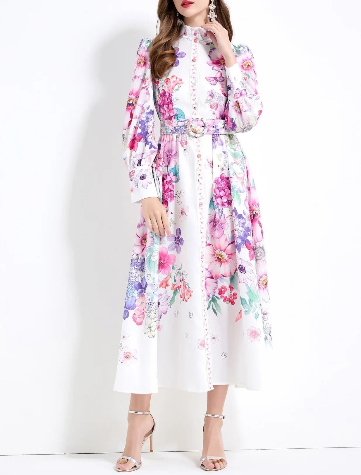 送料無料 ◆ D2580 ベルト付き フラワー 胡桃ボタン 前開き クラシカル ロング ワンピース《ホワイト×パープルピンク》花柄 ラグランスリーブ クラシカル ブラック 黒 白 ベージュ ロングワンピース エレガント アニマル柄 レオパード柄 ロングワンピ クラシック ヴィンテージ ロング インポートワンピース お呼ばれ パーティードレス メール便 パーティーワンピ 袖付き お呼ばれワンピース マキシ 長袖 インポートワンピース お呼ばれ 上品 パーティー 衣装 柄物 柄ワンピース