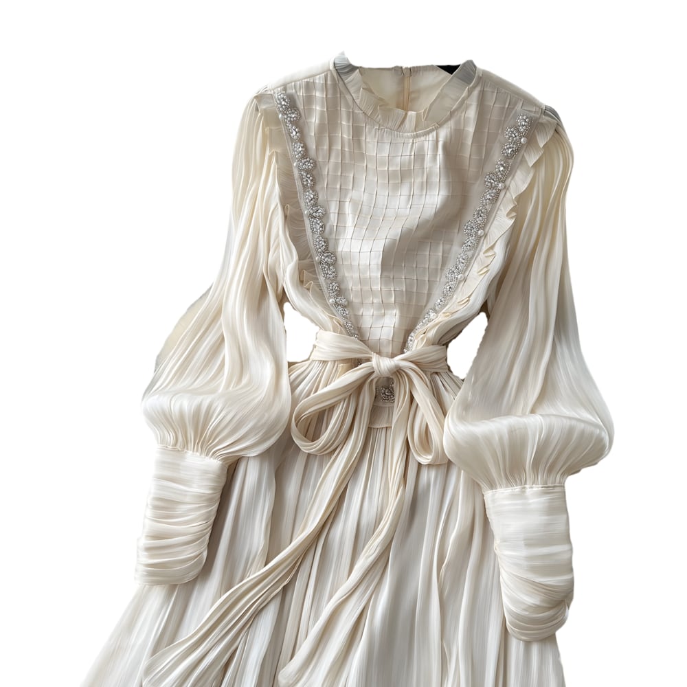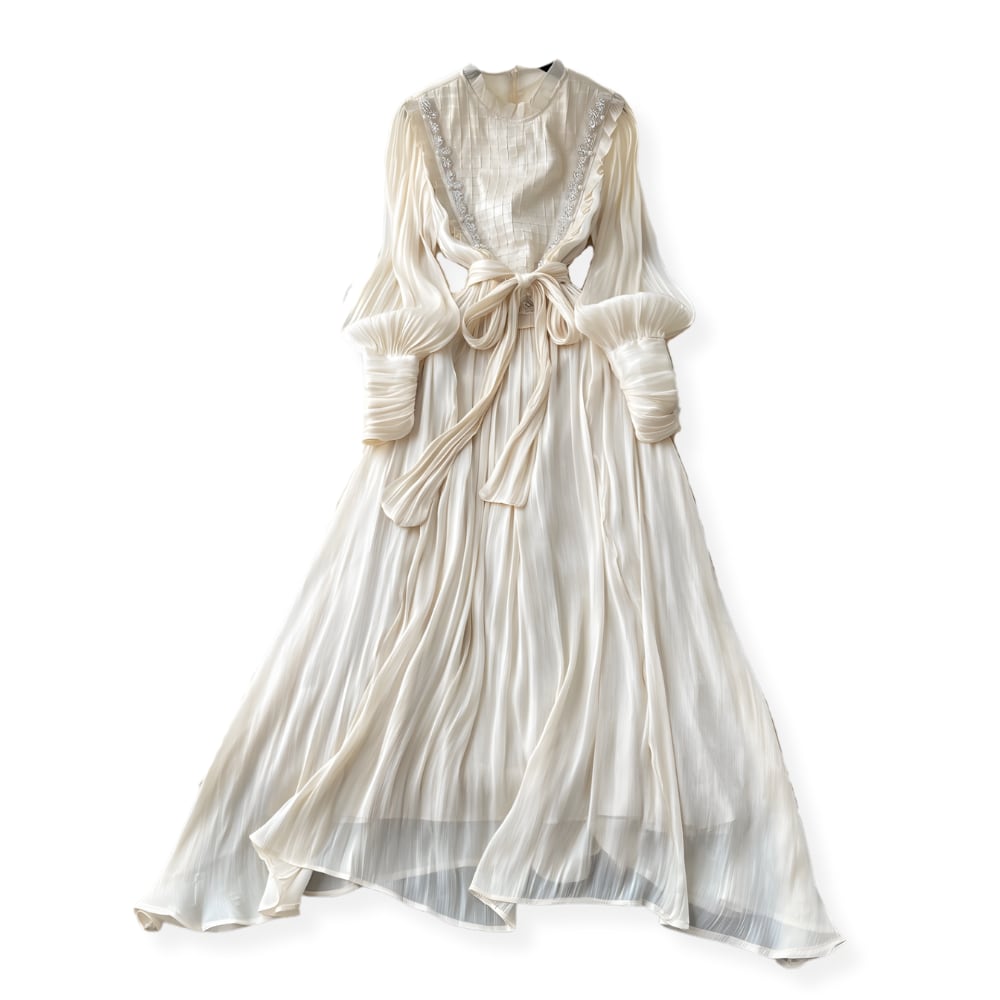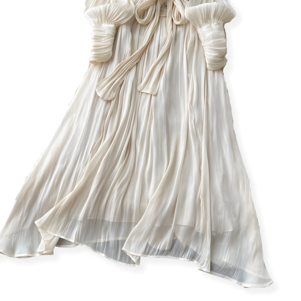 送料無料 ◆ D2589 リボン付き パール ビーズ ヨーク ロングカフス バルーンスリーブ ロングドレス ワンピース《 オフホワイト 》パールホワイト 白 長袖 シャイニー 袖あり 白ワンピース クラシカルワンピース インポートワンピース パーティードレス 衣装 メール便 パーティーワンピ 袖付き お呼ばれワンピース お食事 ひざ丈 おしゃれ 無地 袖あり カジュアル インポートワンピース お呼ばれ お出かけ 上品 クリスマス パーティー 卒業パーティー 謝恩会