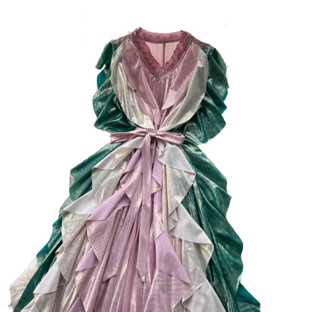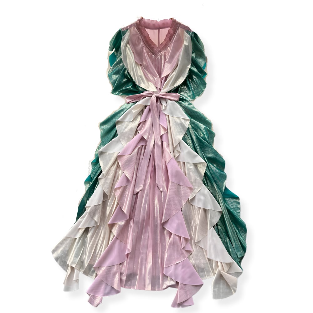 送料無料 ◆ D2538 リボン付き カラー 配色 ラッフルフリル シャイニー ロング ワンピース《 ピンク×グリーン》 3色 クラシカル 無地 緑 ピンク 白 パーティードレス お呼ばれ メール便 カラフル パープル ピンク ホワイト ベルト フリル パーティー 結婚式 お呼ばれ ノースリーブ ワンピース ドレス ロングワンピース フリル フリフリ 卒業パーティー 謝恩会 同窓会 発表会