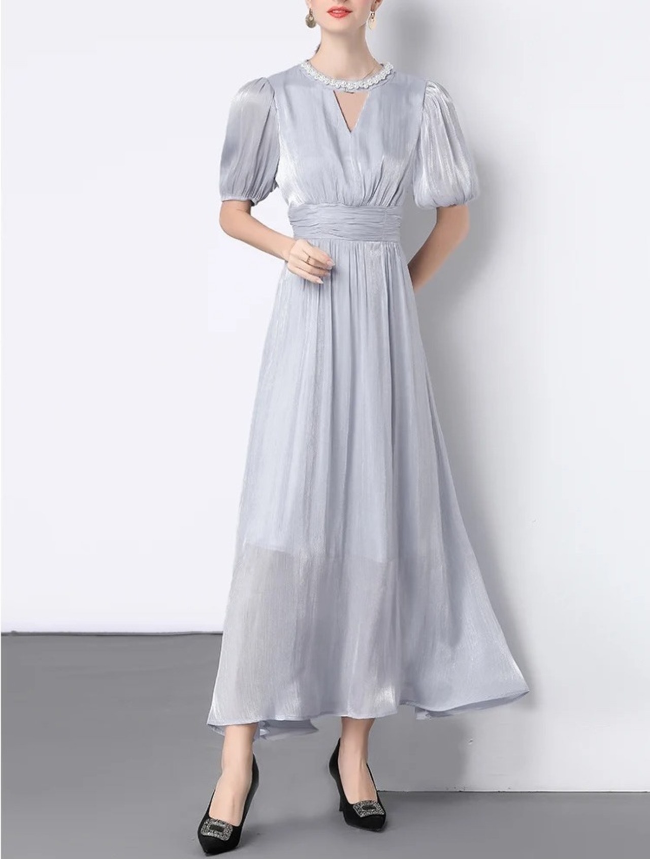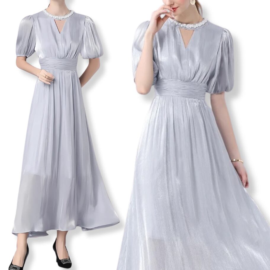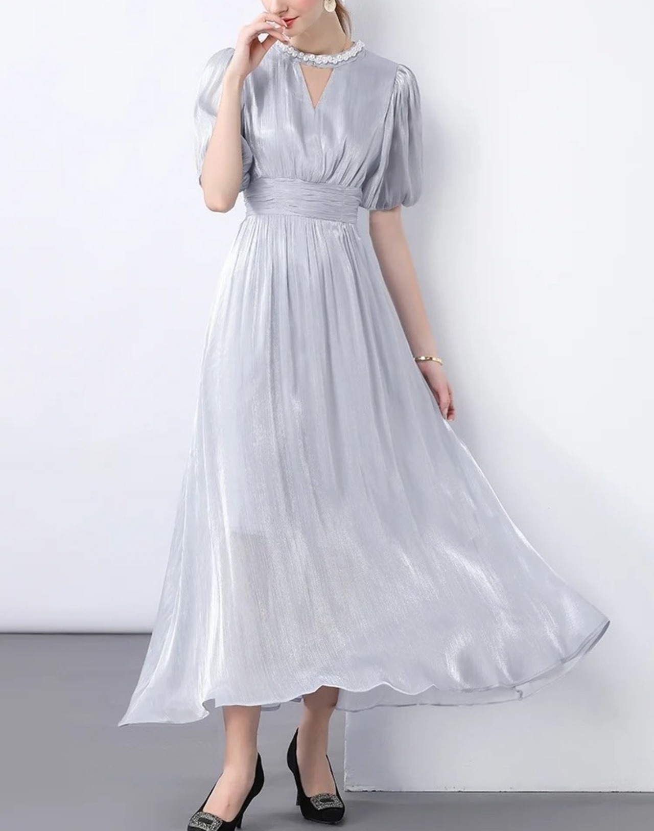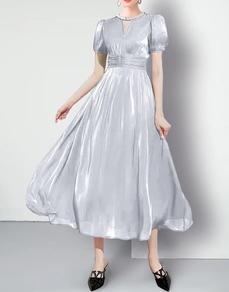 《訳ありアウトレット》送料無料 ◆ D2402 パール ネック シャイニー ロング ドレス ワンピース《パールグレー 》 フレアワンピース ワンピース 青ドレス 無地 膝丈 ひざ下 インポートワンピース パーティードレス メール便 パーティーワンピ 袖付き お呼ばれワンピース ドレス 衣装 膝下 ドレス ワンピ ドレス インポートワンピース お呼ばれ デート 上品 衣装 エレガント お出かけ 発表会 同窓会 謝恩会 訳あり ワケあり わけあり B品 セール