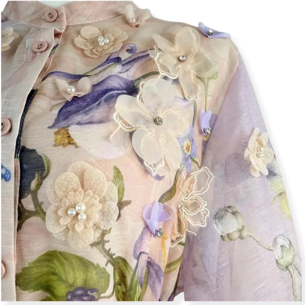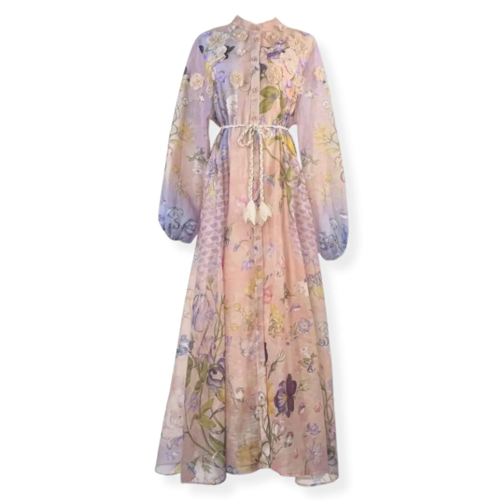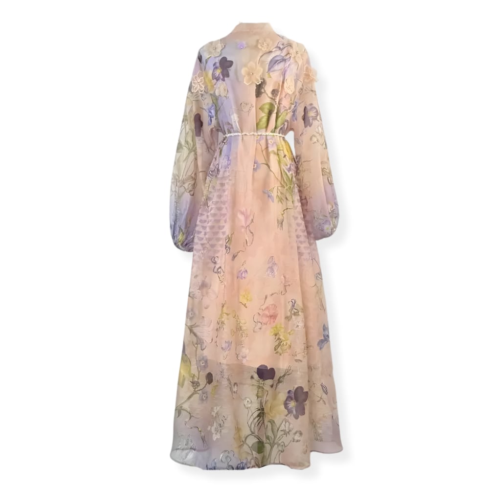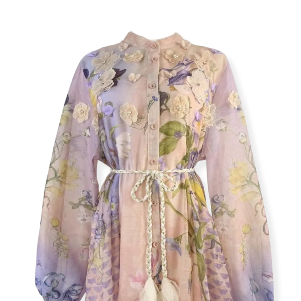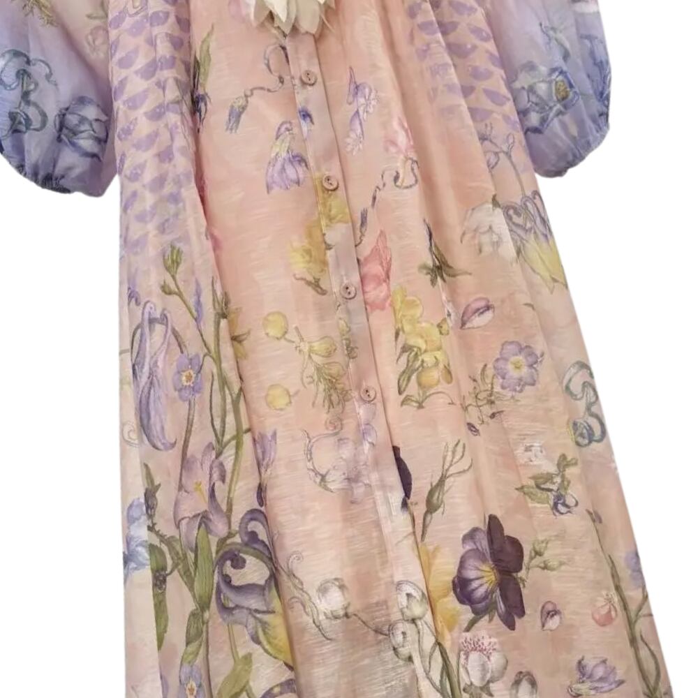 送料無料 ◆ D2596 三つ編みベルト&ペチコート付き 立体 フラワーモチーフ バルーンスリーブ 前開き ドレス ワンピース《 シェルピンク×ラベンダー 》 白ワンピース ホワイト 白 白ワンピ クラシカル インポートワンピース 膝丈 インポートワンピース メール便 裏地あり 上品 エレガント マキシ ロング パーティー 衣装 ワンピ インポートドレス