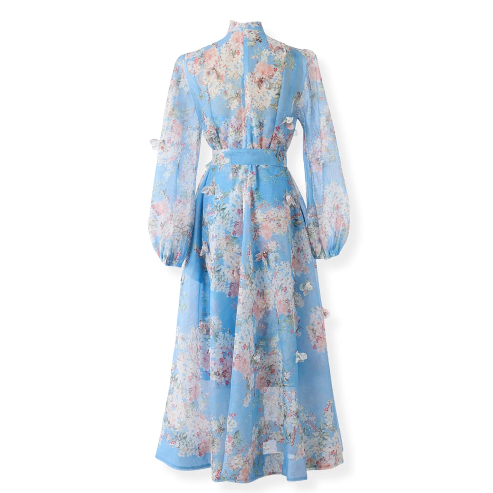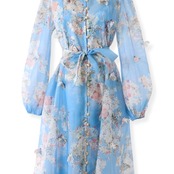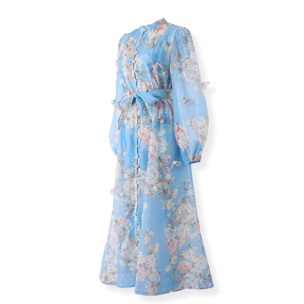 送料無料 ◆ D2598 ペチコート &リボン付き カメリアボタン 花柄 フラワー ビジュー 装飾 前開き バルーンスリーブ ロング ワンピース《 ホワイト×ブルー 》カラフル 桜 サクラ 桜柄 クラシカルボタン ゴールドボタン 花柄 クラシカルボタン ボタン 袖あり クラシック 柄物ワンピース 柄ワンピース 柄物 レトロ ヴィンテージ風 ワンピース クラシックワンピース ドレスワンピース 袖あり ミモレ 膝下 膝下丈 ワンピース お呼ばれ おしゃれ 衣装 おでかけ エレガント 上品 カジュアル