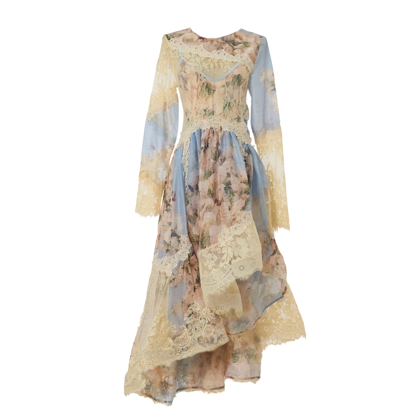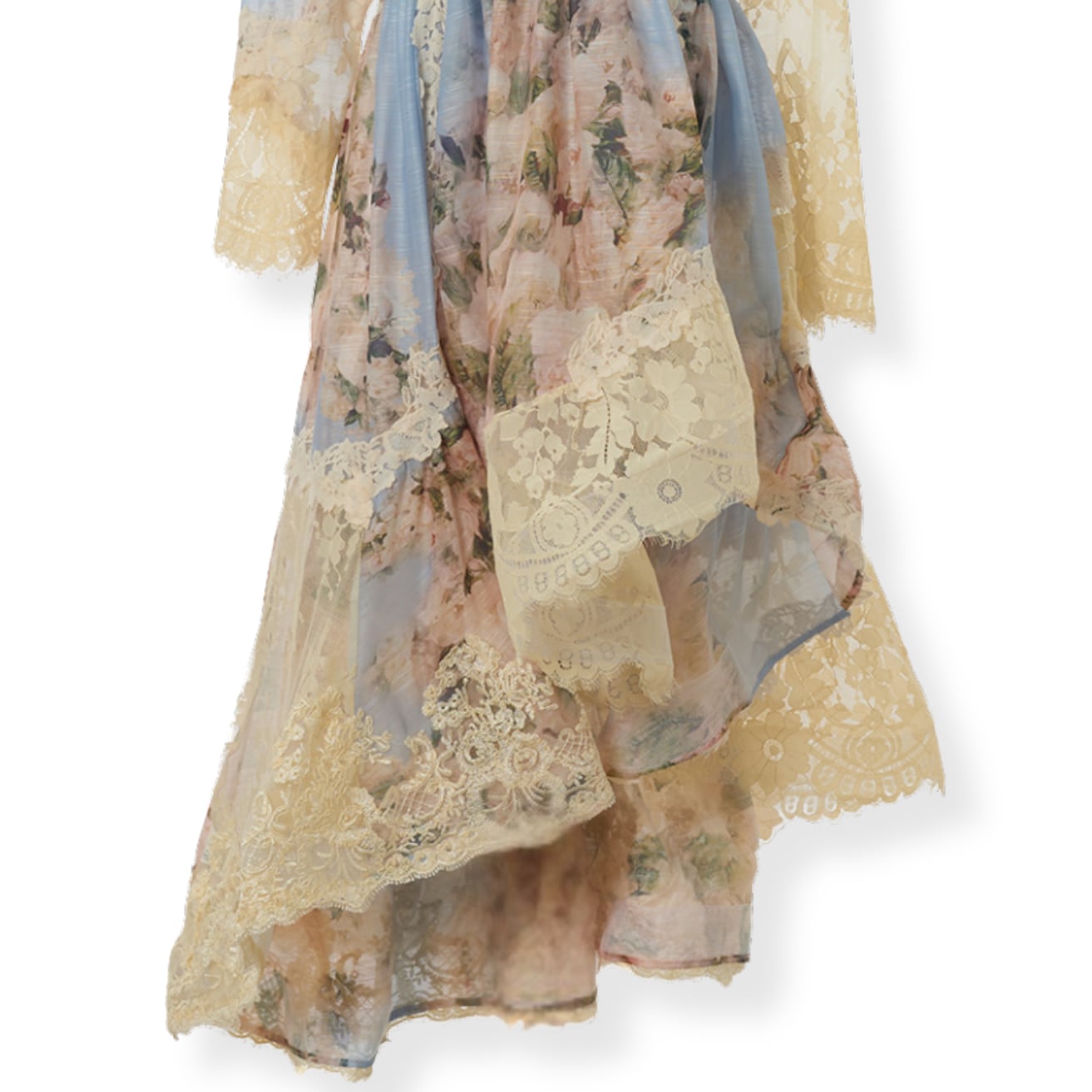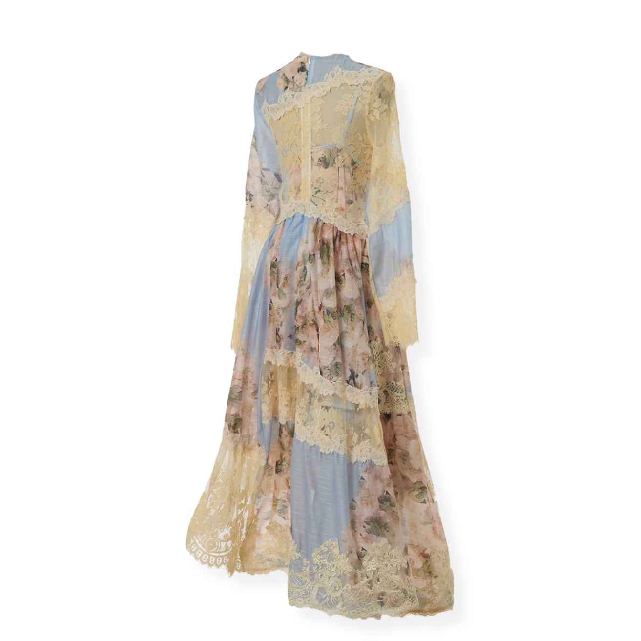 レースとクラシカルな花柄がパッチワークの様にランダムに重なっています