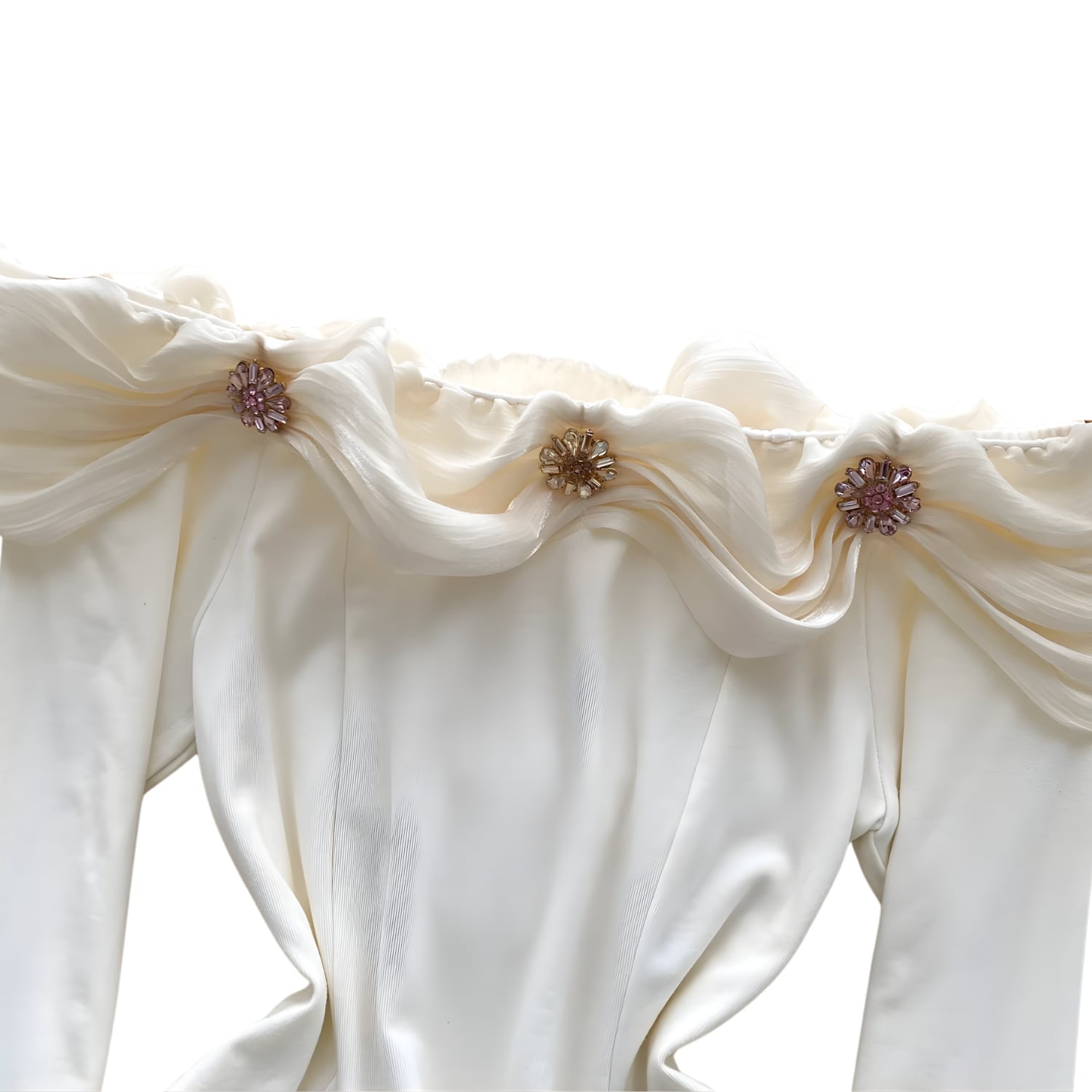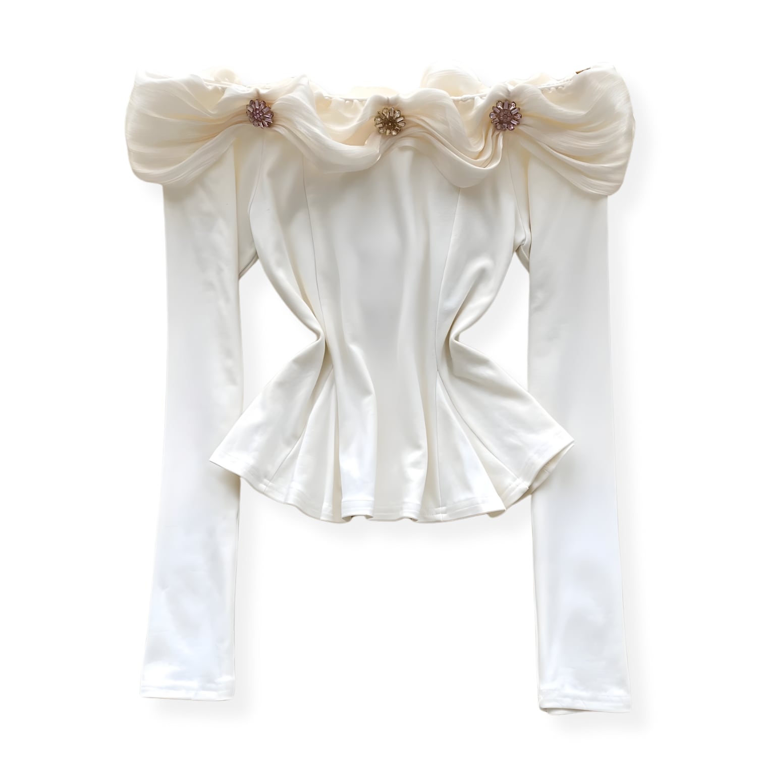 送料無料 ◆ D2613 ビジュー付き ドレープ オフショルダー トップス 《 オフホワイト 》白 無地 カットソー 伸縮性 トップス 長袖 袖あり 無地 カジュアル セミフォーマル トップス インポート パーティードレス カジュアル メール便 カジュアル モード おしゃれ お出かけ お呼ばれ オフィスカジュアル オフィス 衣装 モード