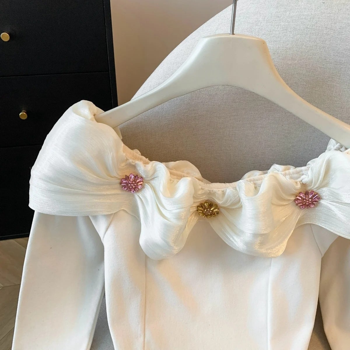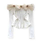ビジュー付きのオフショルダーのトップスです