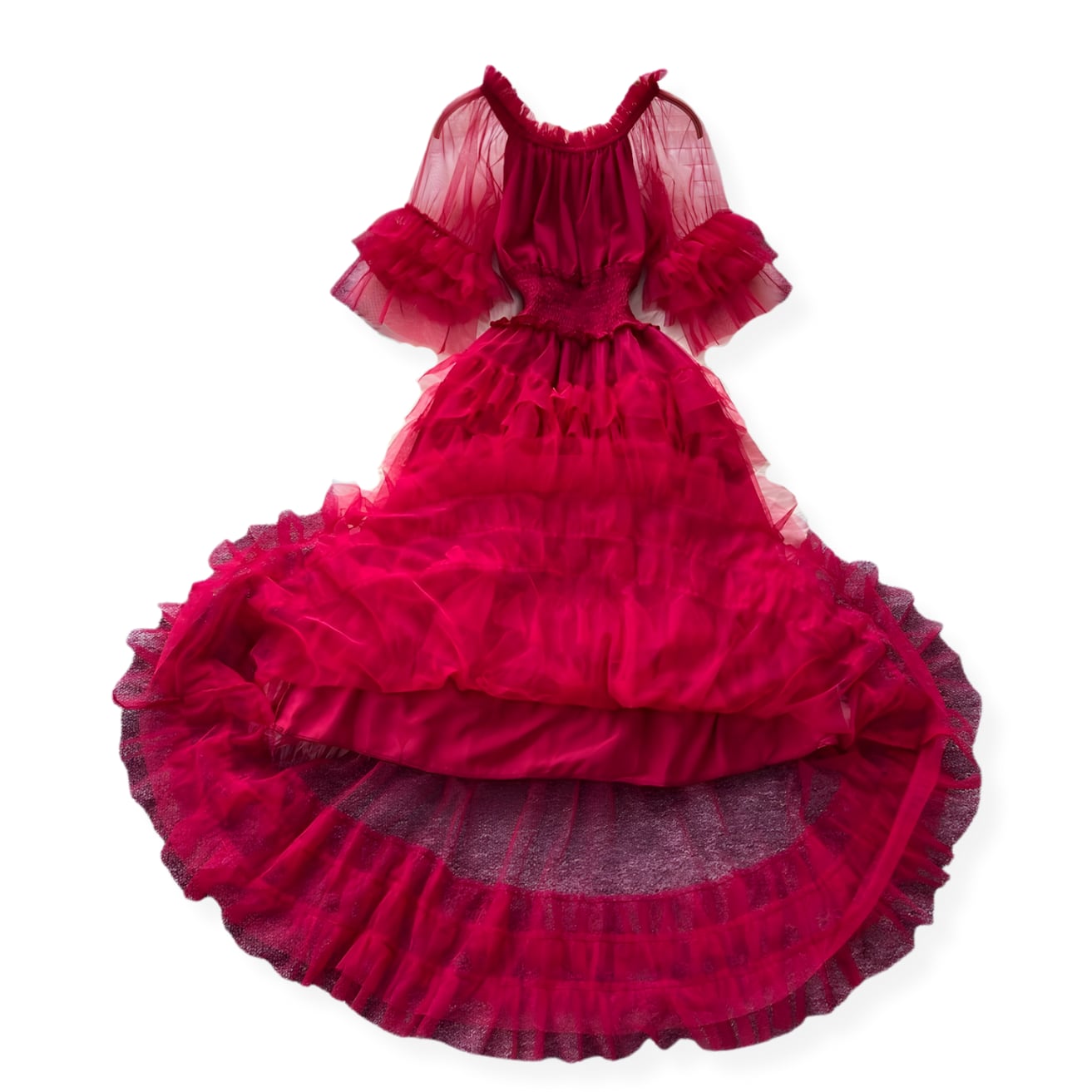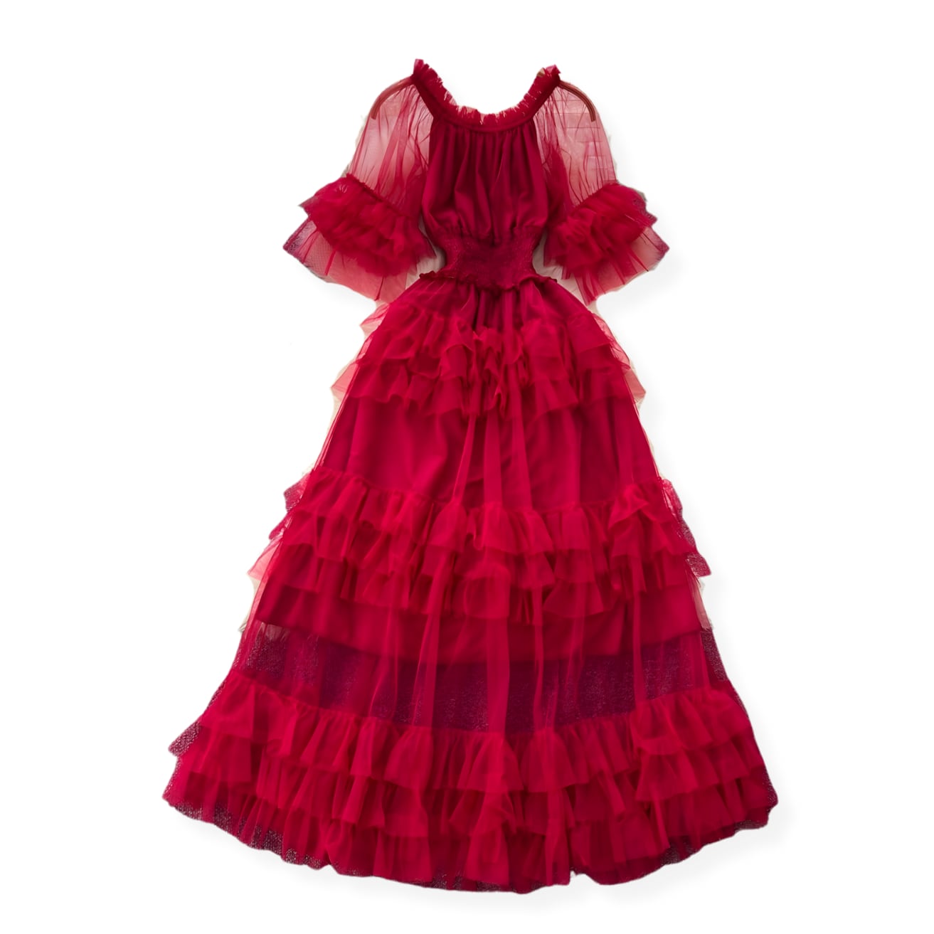 ふわふわとしたレッドのティアード チュールワンピース
