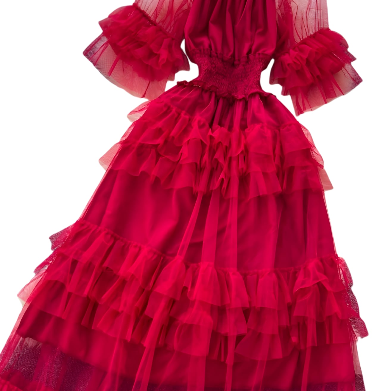 送料無料 ◆ D2615 チュール ウエスト シャーリングゴム ティアード オフショルダー 2way ロング ドレス ワンピース《 レッド 》 赤チュール 赤ワンピース 赤 ティアードチュール 半袖 チュールワンピース 袖あり チュールワンピース ドレス フレア ワンピース マキシ インポートワンピース 結婚式 パーティードレス パーティーワンピ 袖付き ドレス 衣装 膝下 半袖 袖あり 裏地付き インポートワンピース お呼ばれ 上品 衣装 卒業パーティー 同窓会 謝恩会