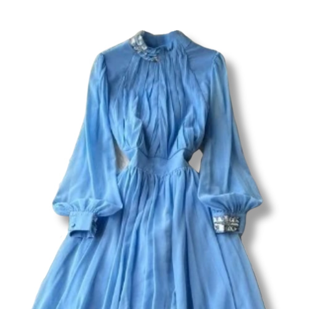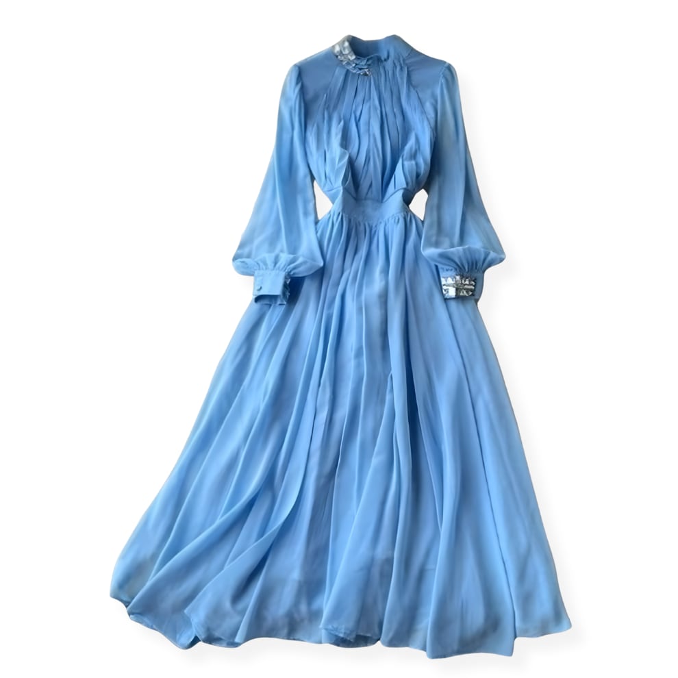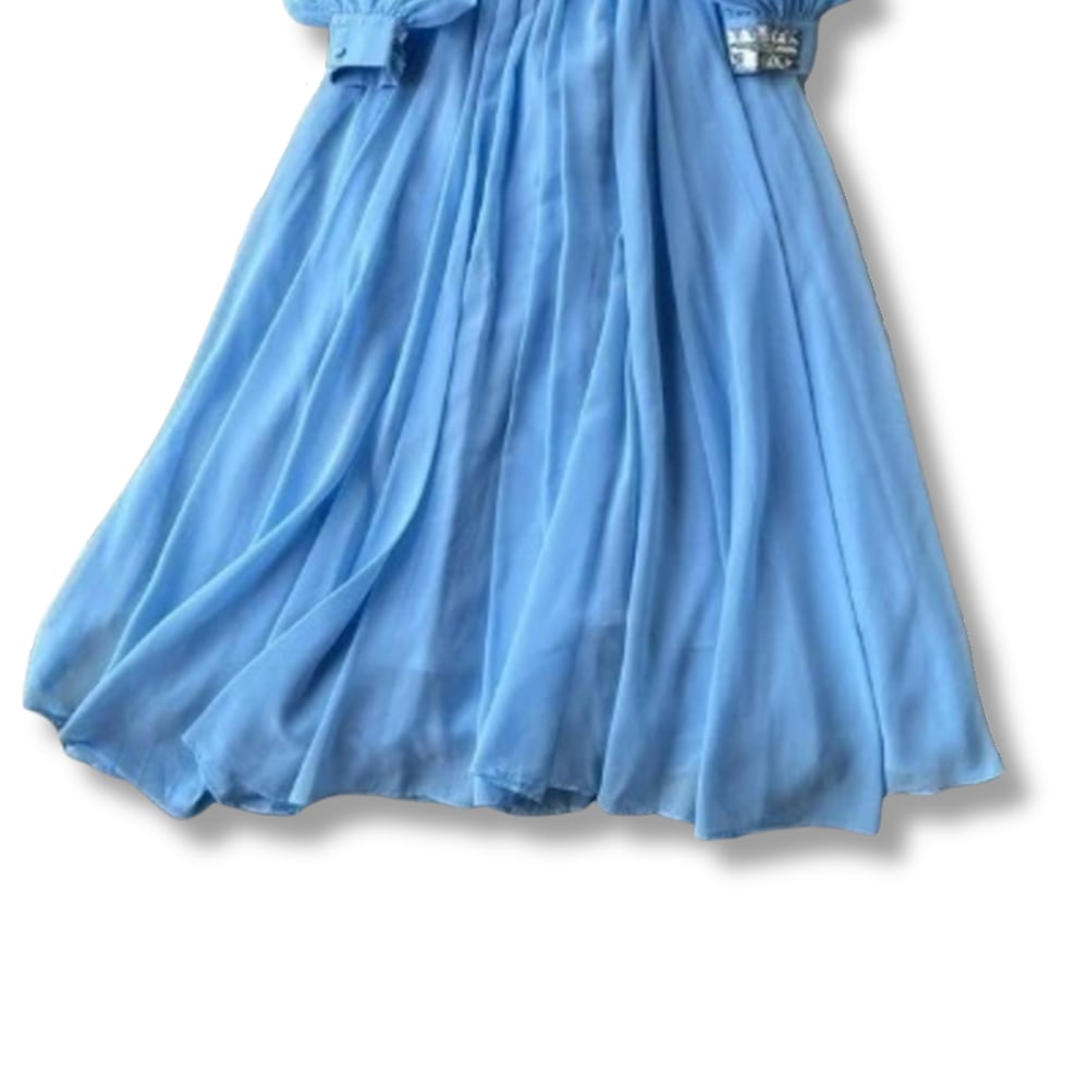 送料無料 ◆ D2626 ビジュー付き スタンドネック ウエストバックリボン バルーンスリーブ フレア ロング ワンピース《 ライトブルー 》 水色 ワンピース シフォン フレア 無地 ワンピース レース ロング インポートワンピース お呼ばれ 結婚式 パーティードレス パーティーワンピ 袖付き お呼ばれワンピース セミフォーマル ひざ丈 長袖 裏地付き 透けない インポートワンピース お呼ばれ ウェディング 上品 結婚式 卒業パーティー 謝恩会 同窓会 発表会 オケージョンドレス セレモニー