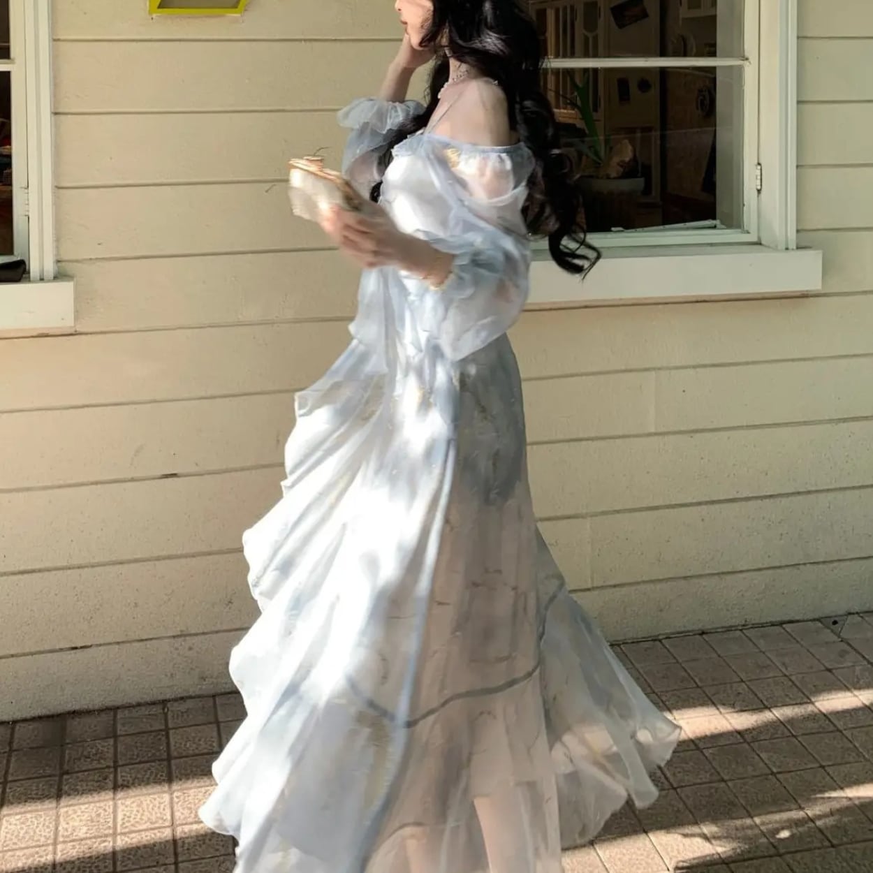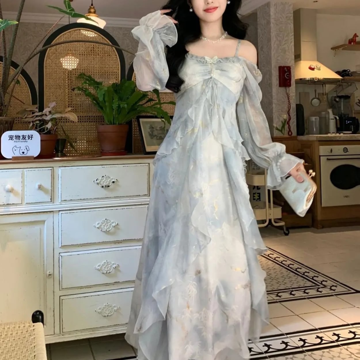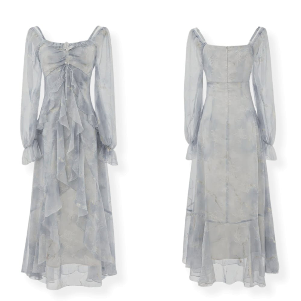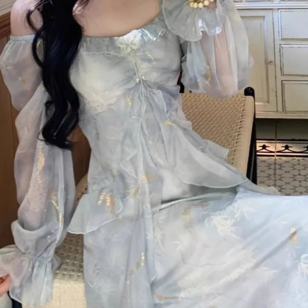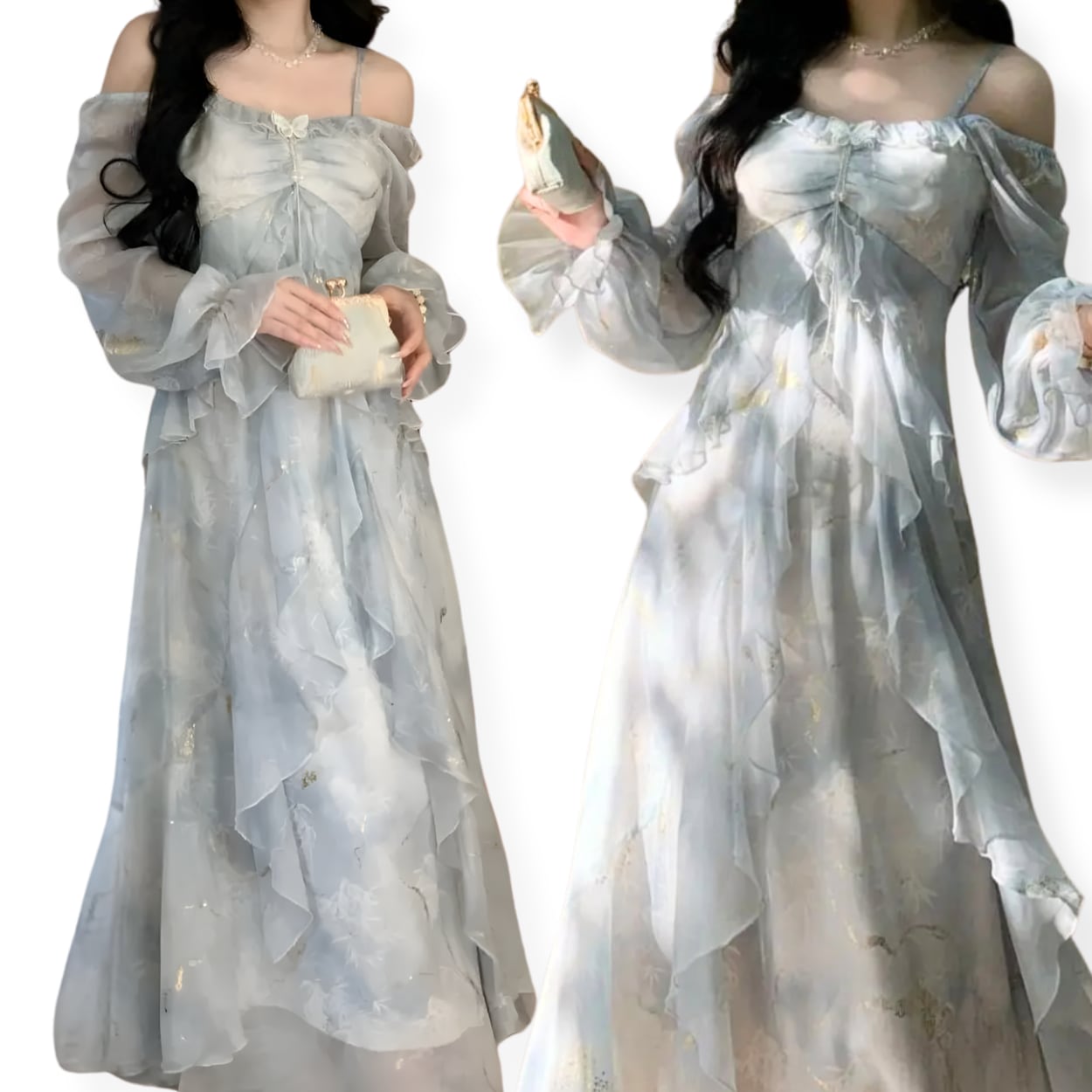 送料無料 ◆ D2631 パール 刺繍 バタフライブローチ付き ゴールド オフショルダー 2way キャンディースリーブ ロング ワンピース《 ライトグレー 》 蝶々 アイスグレー 箔押し ブルーグレー 水色 ドレス 長袖 シフォン レイヤード フレア 膝下 ミモレ ロング 袖あり パーティードレス 衣装 同窓会 謝恩会 発表会 卒業パーティー インポートワンピース
