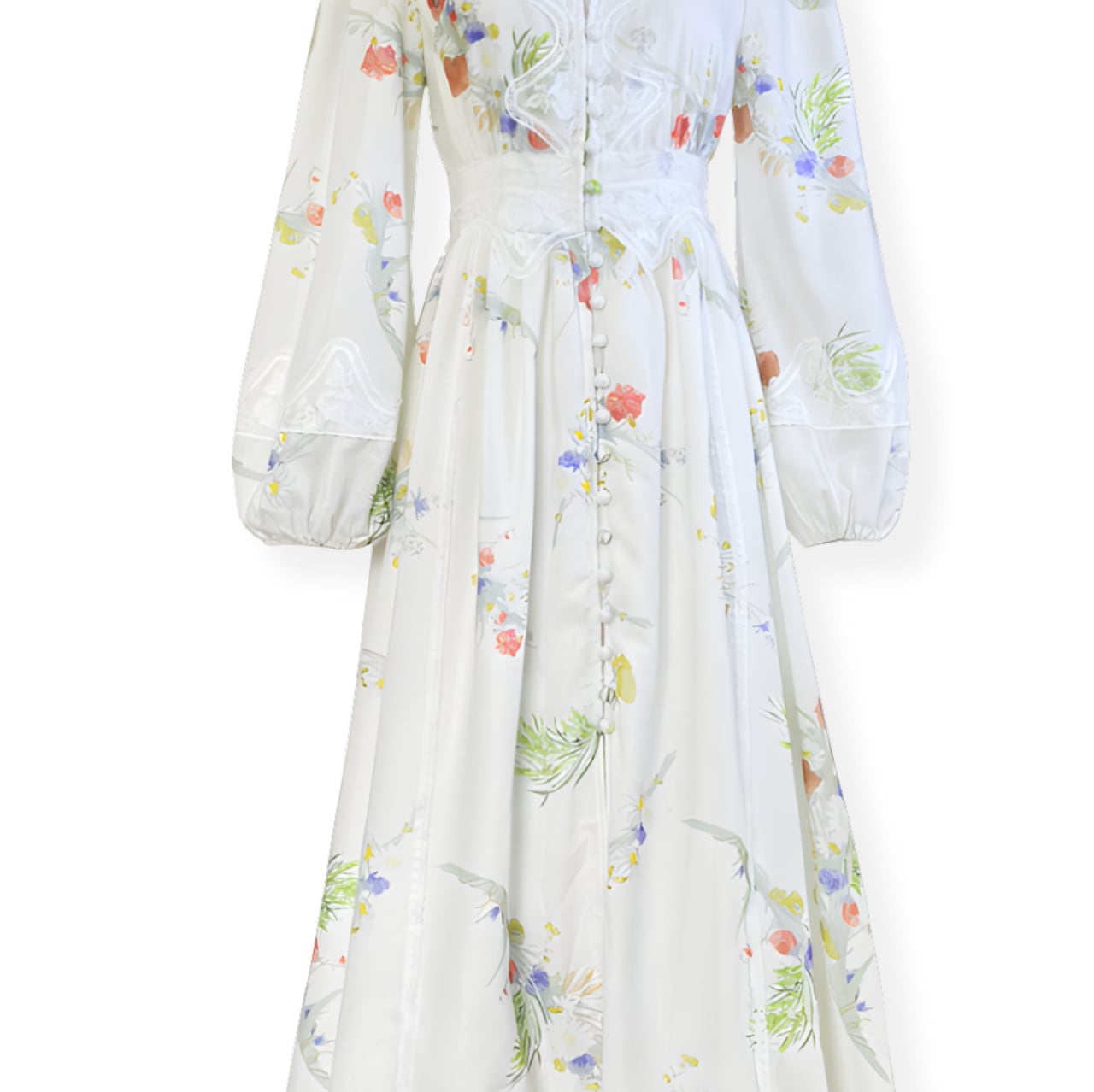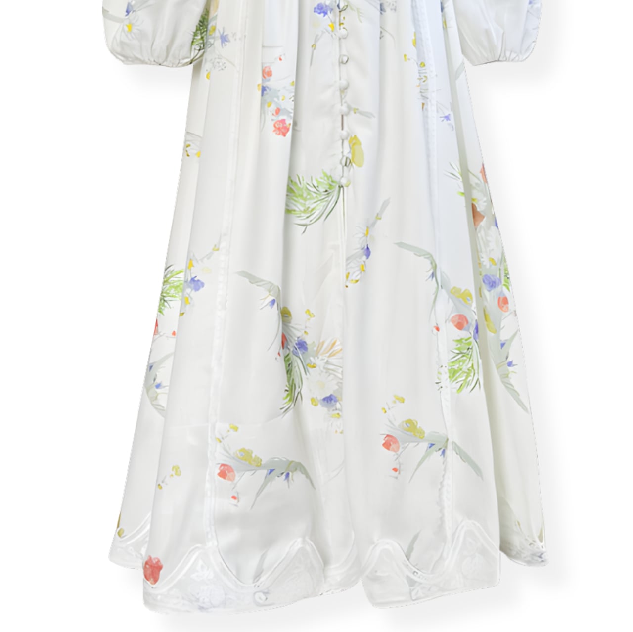 送料無料 ◆ D2649 カラフルフラワー Vネック レース 胡桃ボタン バルーンスリーブ ロング ワンピース《 ホワイト×カラフル 》白 カラフル マキシ 長袖 シャツワンピース マキシ 膝下 オリエンタル フラワー シャツワンピース インポート パーティードレス カジュアル 華やか 上品 メール便 パーティーワンピ お呼ばれワンピース お食事 ひざ丈 おしゃれ 上品 マルチカラー カラフル 袖あり インポートワンピース 華やか