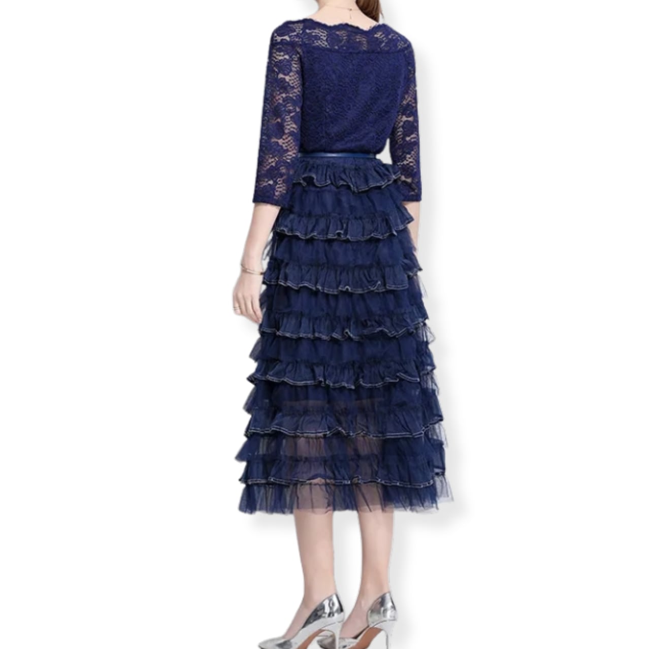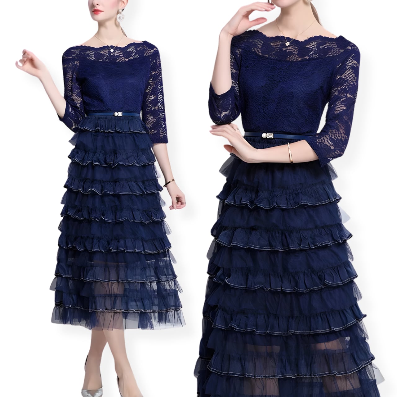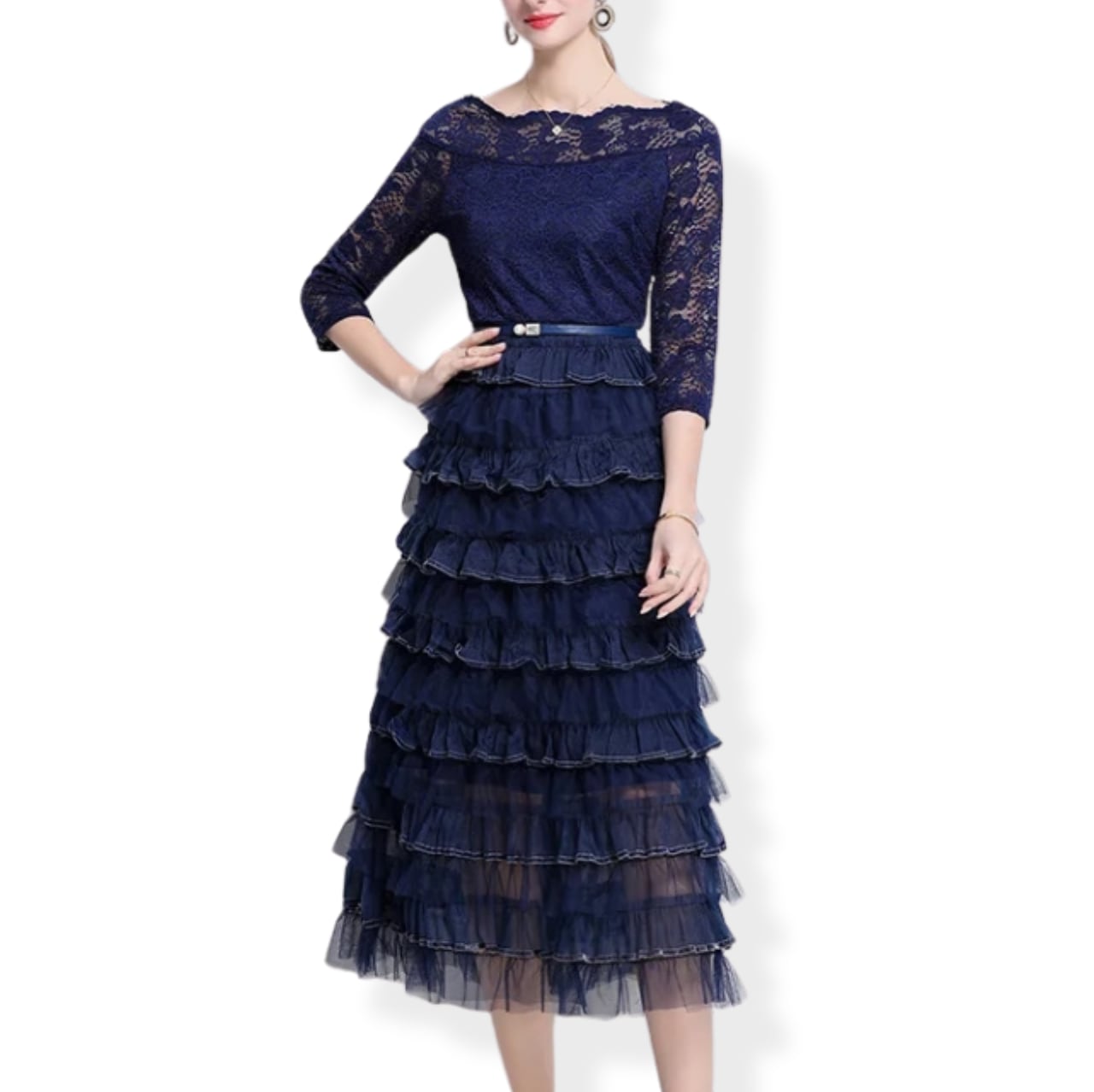 送料無料 ◆ D2651 ベルト付き オフショルダー レース × ティアード フリル 切替 ロング ワンピース《 ネイビー 》青 青色ドレス 長袖 長袖ドレス ドッキングワンピース 異素材 ミックス インポート パーティードレス カジュアル 上品 パーティーワンピ お呼ばれワンピース おしゃれ 袖あり ロングワンピース 膝下 秋冬 衣装 インポートワンピース 卒業パーティー 謝恩会 同窓会 発表会 オケージョン オケージョンドレス クリスマス