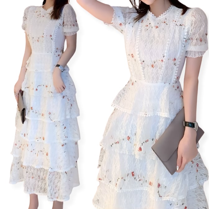 送料無料 ◆ D2657 フラワー 刺繍 ティアード レース ハーフスリーブ ロング ワンピース《 ホワイト 》小花刺繍 ティアードワンピース ティアードドレス ピンク 刺繍ワンピース 刺繍ドレス 花刺繍 総刺繍 ワンピース マキシ インポートワンピース 結婚式 パーティードレス メール便 パーティーワンピ 袖付き お呼ばれワンピース ドレス 衣装 膝下 袖あり 裏地付き インポートワンピース お呼ばれ 上品 衣装 半袖 同窓会 謝恩会