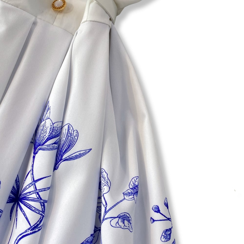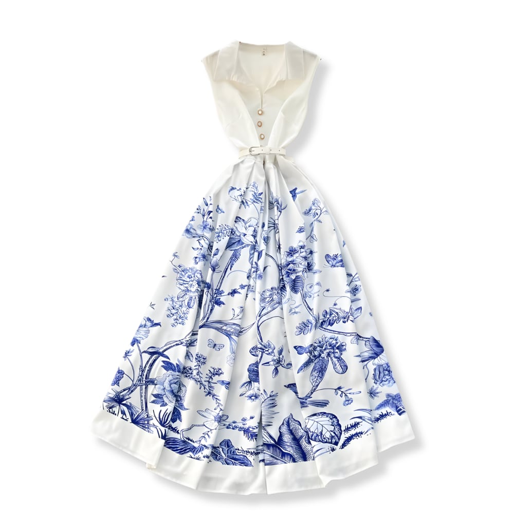 送料無料 ◆ D2665 ホワイトベルト付き スキッパーカラー クラシカルボタン ノースリーブ ボタニカル ドレス ワンピース《ホワイト×ブルー 》 白ワンピース ホワイト 白 白ワンピ クラシカル インポートワンピース ノースリーブ 膝丈 インポートワンピース メール便 裏地あり 透けない 上品 エレガント マキシ ロング パーティー 衣装 ワンピ インポートドレス