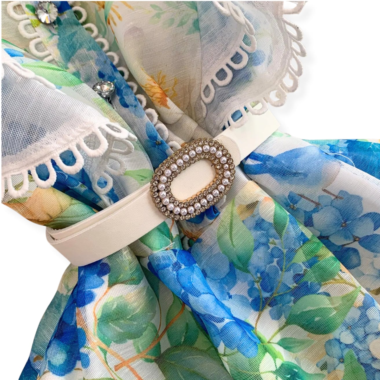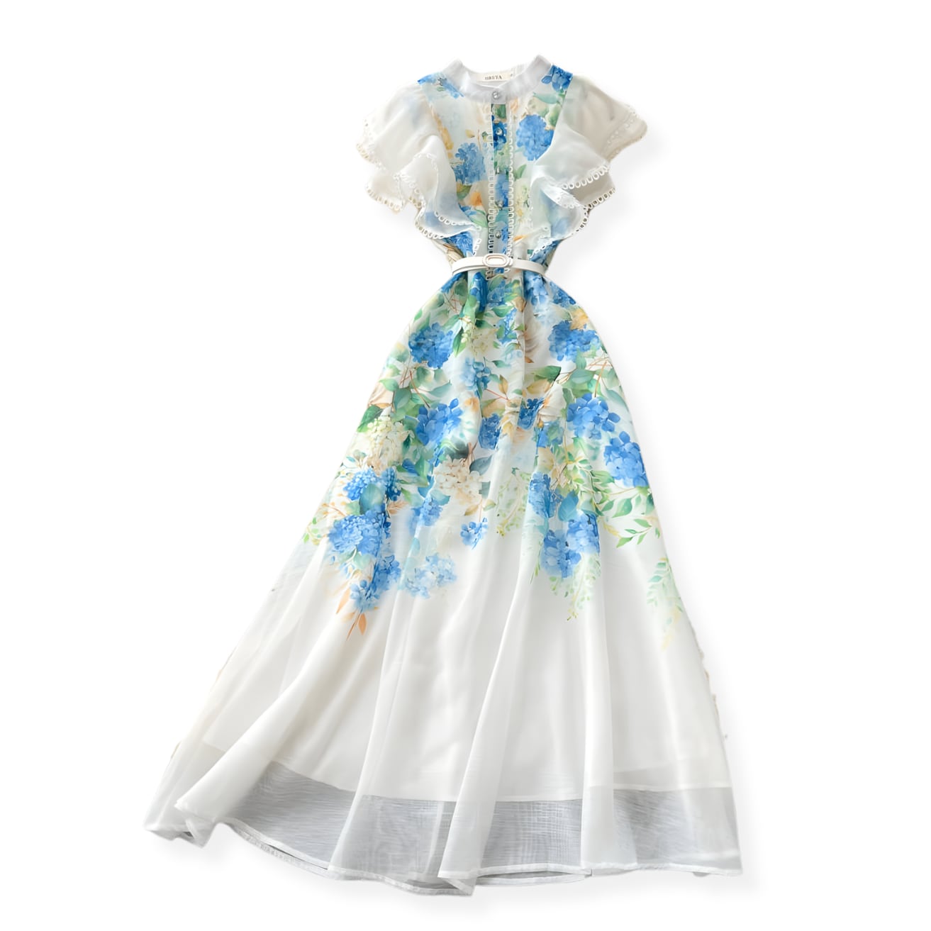 送料無料 ◆ D2667 ベルト付き フラワー バード ホワイト ダブルフリルスリーブ スカラップレース ビジューボタン ロング ドレス ワンピース《ホワイト×ブルー 》 ブルーワンピース 青 水色 インポート パーティードレス クラシック ロングワンピ 膝下 パーティーワンピ お呼ばれワンピース お食事 ひざ丈 おしゃれ 袖あり インポートワンピース ロングワンピース 上品 お出かけ 衣装 ライトブルー 爽やか