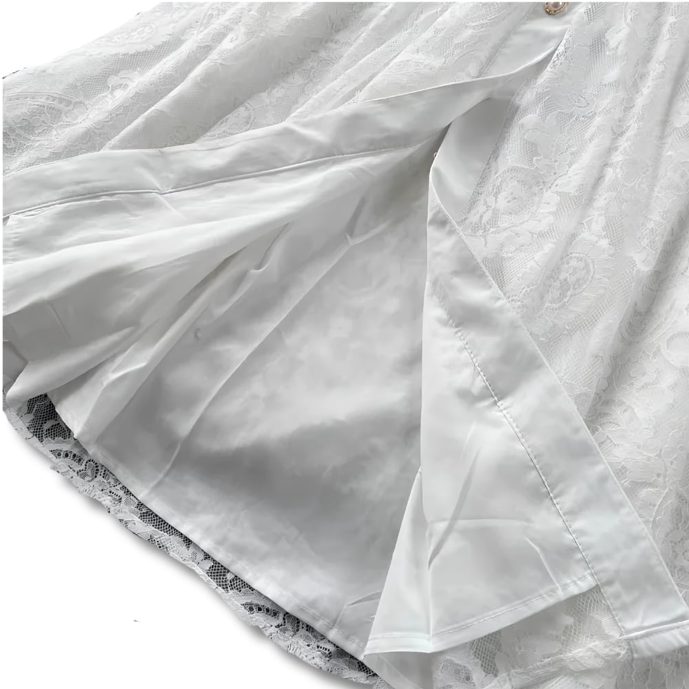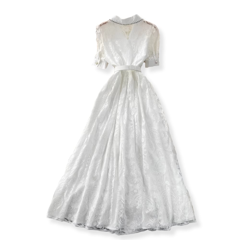 送料無料 ◆ D2669 シルバービジュー バックル ベルト付き 開襟 パールボタン 前開き レース ロング ドレス ワンピース《 ホワイト》 白ワンピース インポート パーティードレス クラシック ロングワンピ 膝下 メール便 パーティーワンピ お呼ばれワンピース お食事 ひざ丈 おしゃれ 袖あり インポートワンピース ロングワンピース 上品 お出かけ 衣装 ライトブルー 爽やか