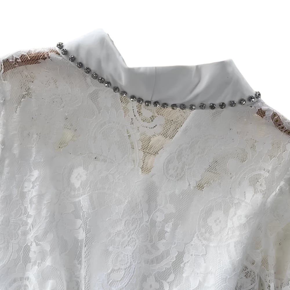 ビジュー付きの開襟で顔周りも華やかでスッキリとしています