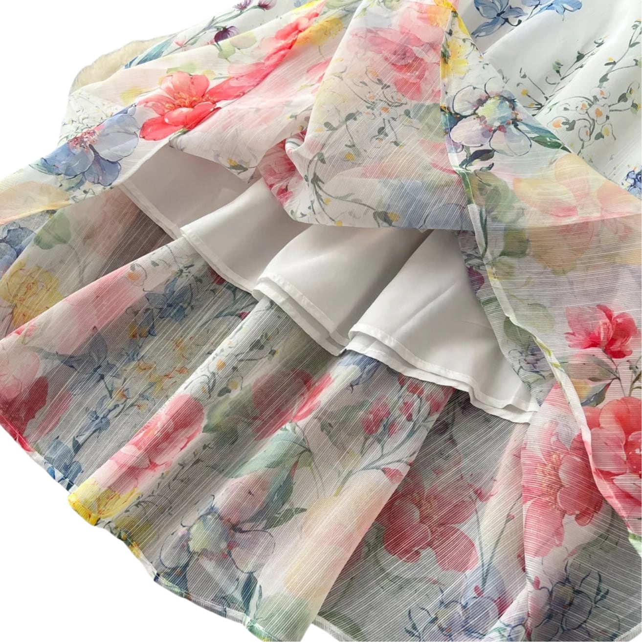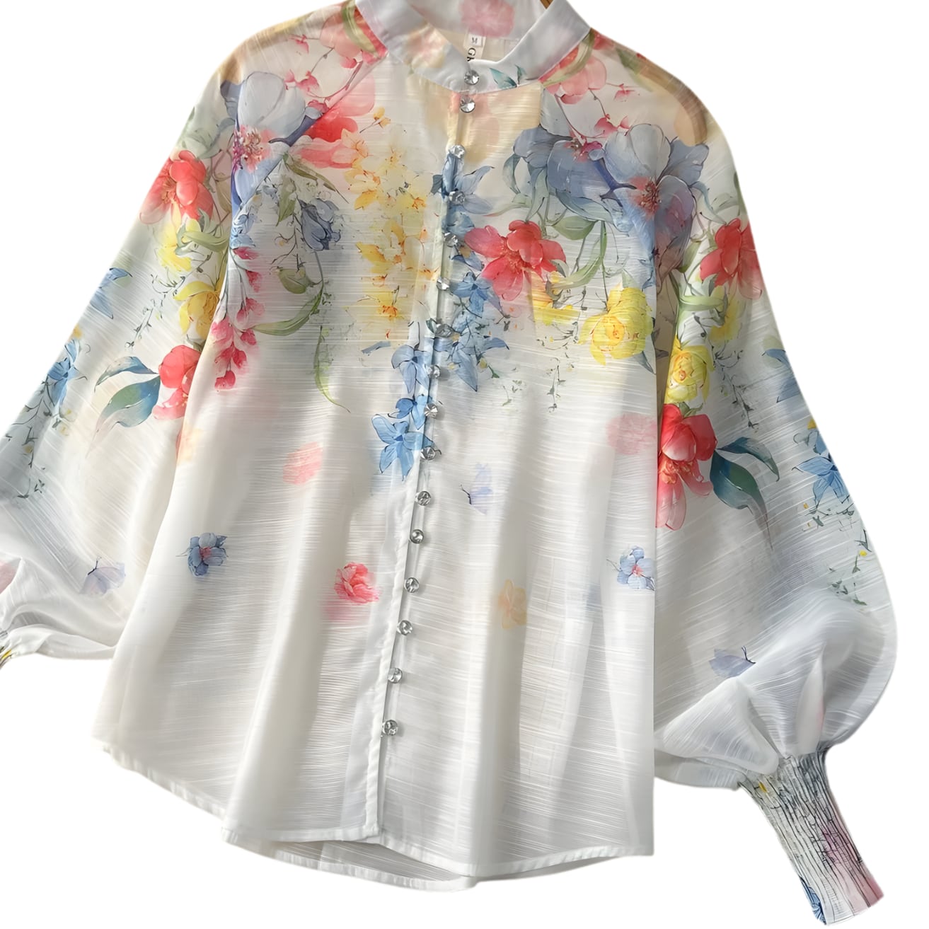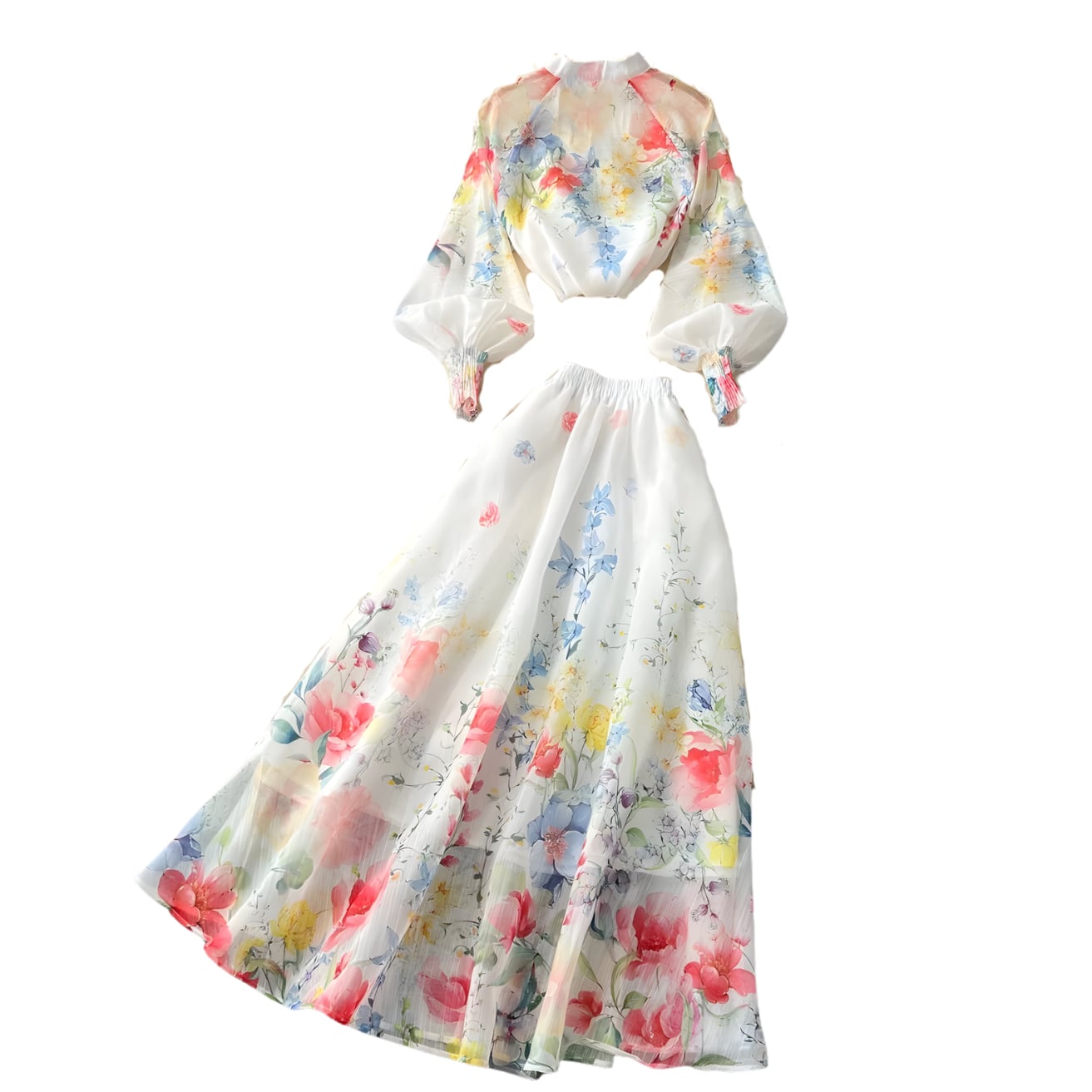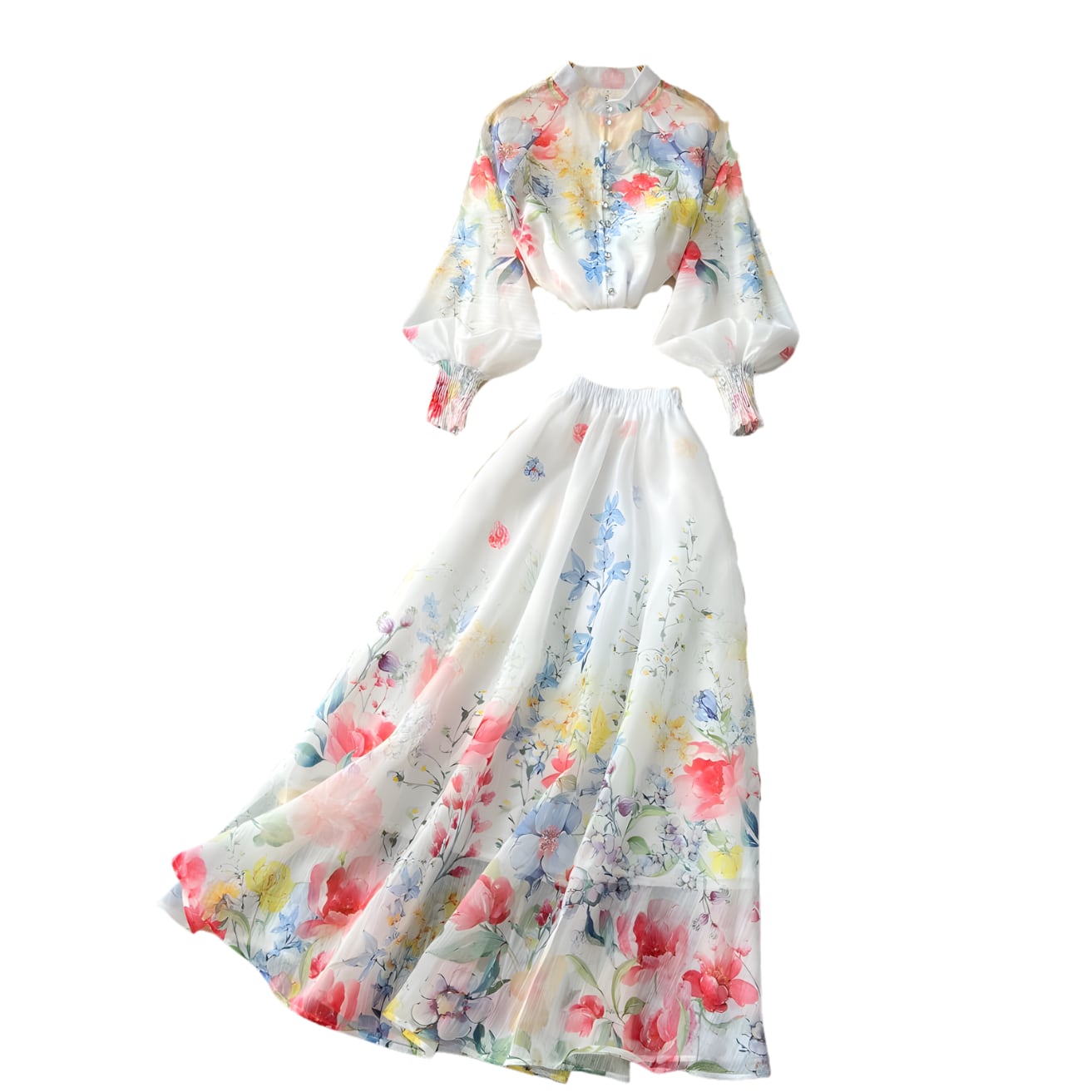 送料無料 ◆ D2678 カラフル フラワー ビジューボタン 長袖 ドレスシャツ ブラウス & ウエストゴム ロングスカート セットアップ 《 ホワイト×マルチ》 水色 パープル ピンク フラワー 上下セット 3点 コーデセット インポート パーティードレス カジュアル 無地 柄 メール便 上下セット パーティーワンピ お呼ばれワンピース お食事 おしゃれ 袖あり インポートワンピース シアー 花柄 青系 エレガント 衣装 オフィスカジュアル オケージョン