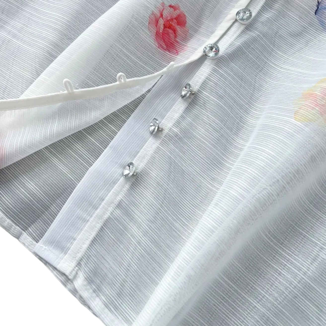ブラウスはシルバーのビジューボタンで首元からウエストまで開きます