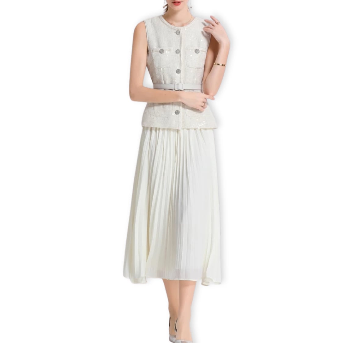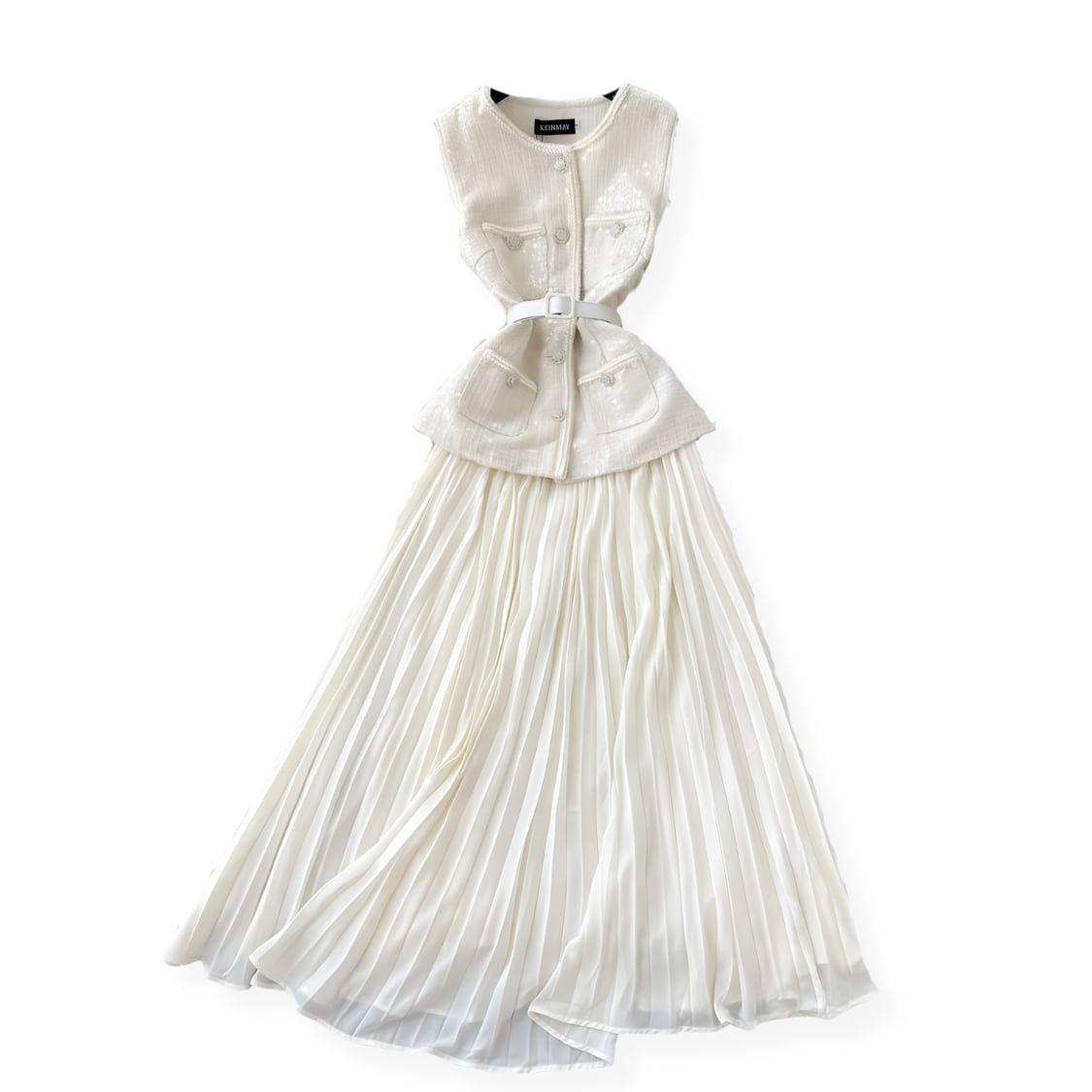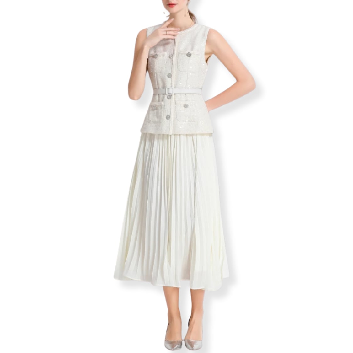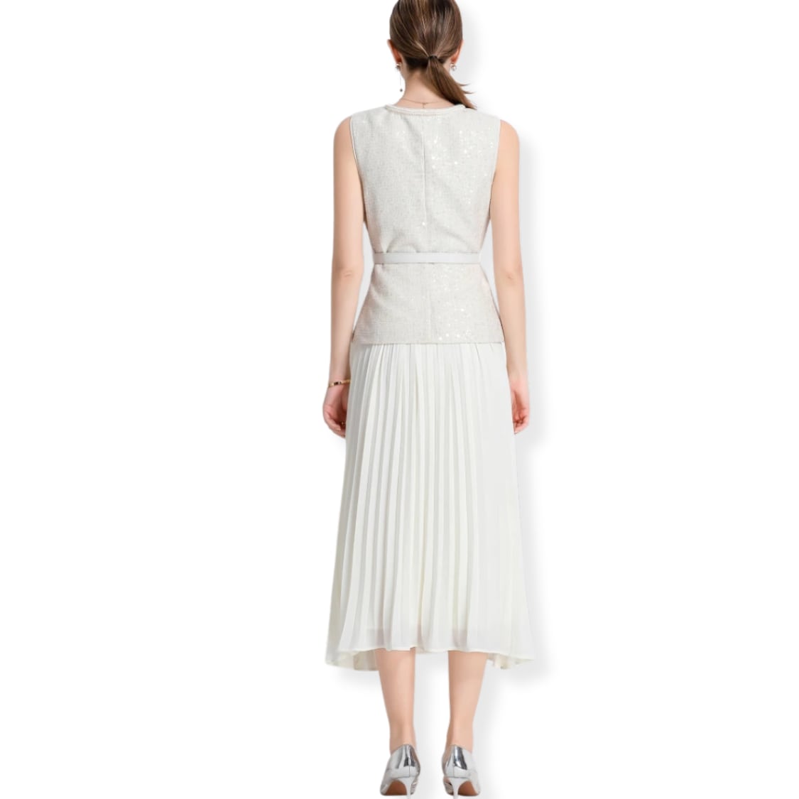送料無料 ◆ D2684 ベルト付き サマーツイード クリアスパンコール ビジューボタン 切替 プリーツ ノースリーブ ロング ワンピース《 ホワイト 》白 レースワンピース プリーツワンピース ホワイトドレス 膝下丈 膝丈 ミモレ丈 インポート パーティードレス お出かけ パーティーワンピ パーティー お呼ばれ お食事 ひざ丈 おしゃれ インポートワンピース ラメツイード スーツ ファーマル オフィスカジュアル セミフォーマル 衣装 発表会 同窓会 謝恩会 上品 エレガント