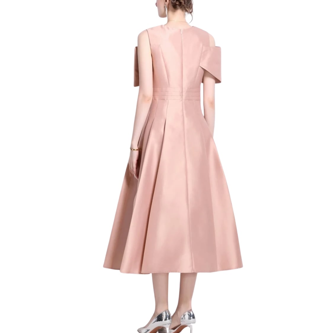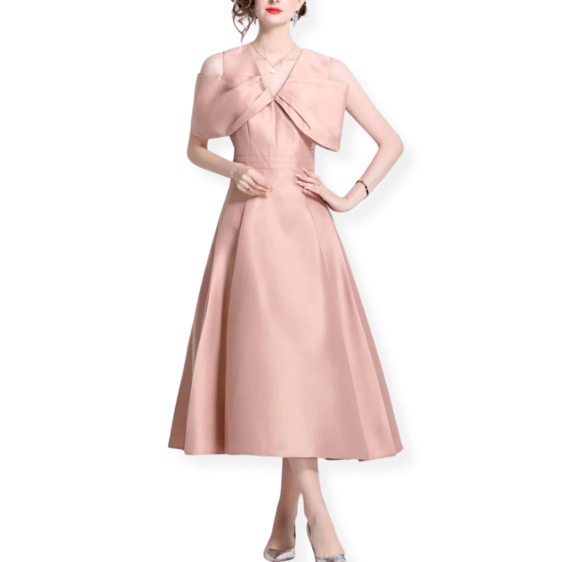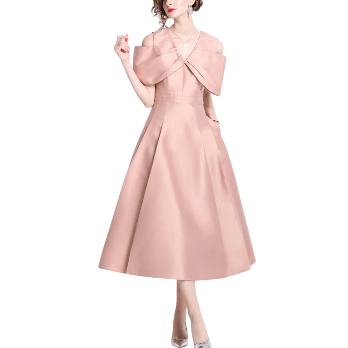 送料無料 ◆ D2685 アシンメトリー リボン Vネック オープンショルダー フレア ドレス ワンピース《 ピンク 》 ピンクワンピース ピンクドレス ロングワンピース ミモレ丈 光沢 インポート パーティードレス お出かけ パーティーワンピ 結婚式 2次会 パーティー お呼ばれ お呼ばれワンピース お食事 ひざ丈 おしゃれ 袖あり インポートワンピース オケージョン フォーマル オケージョンドレス 上品 エレガント