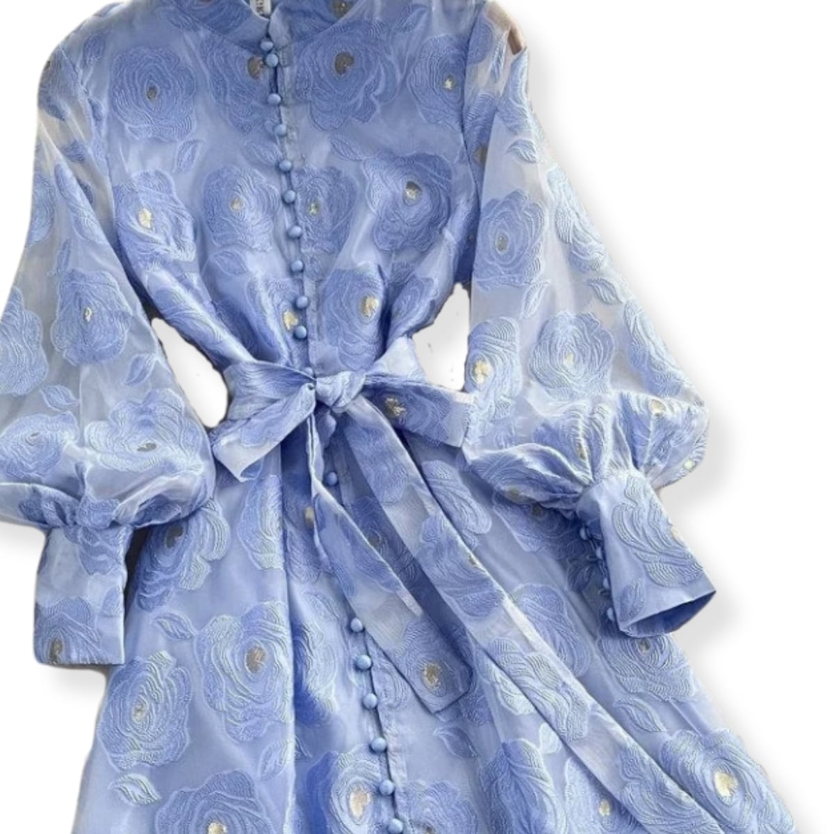 送料無料 ◆ D2662 リボン付き ジャガード ゴールド ローズ 胡桃ボタン バルーンスリーブ ロング ドレス ワンピース《 ライトブルー×ゴールド 》水色 長袖 袖あり 水色ワンピース クラシカルワンピース インポートワンピース パーティードレス 衣装 パーティーワンピ 袖付き お呼ばれワンピース お食事 ひざ丈 おしゃれ 無地 袖あり カジュアル インポートワンピース お呼ばれ お出かけ 上品 クリスマス パーティー 卒業パーティー 謝恩会