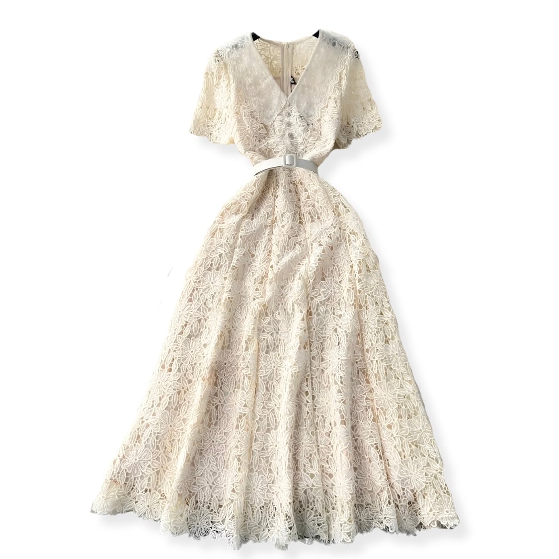 送料無料 ◆ D2692 ベルト付き レース襟 クロッシェレース ビジューボタン ハーフスリーブ ロング ワンピース《 ホワイト 》 白ワンピース ホワイトワンピース ドレス クラシカルボタン 無地 襟付きワンピース 襟つき 白ワンピ 総レース 半袖 膝丈 フラワー インポート パーティードレス カジュアル メール便 パーティーワンピ お呼ばれワンピース お食事 おしゃれ 上品 無地 ワンピース インポートワンピース 柄ワンピース 発表会 ウェディング おでかけ 衣装 セミフォーマル