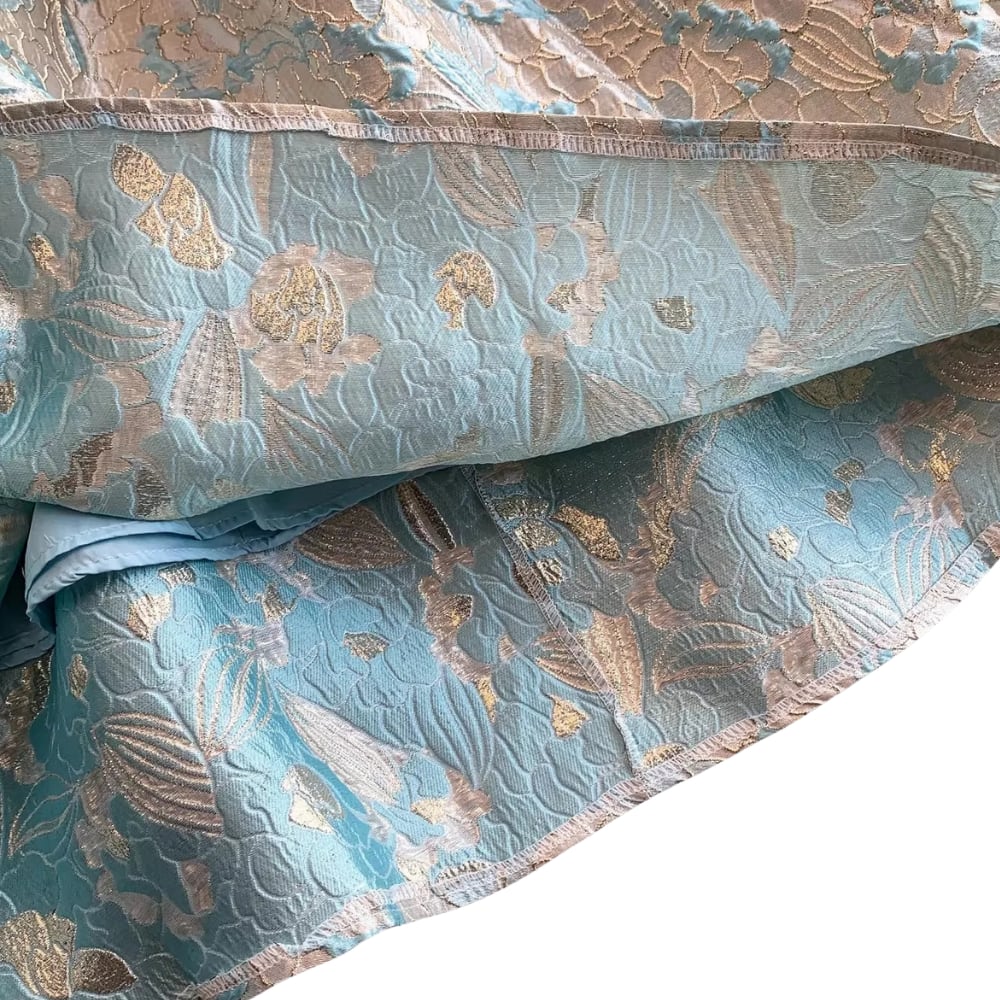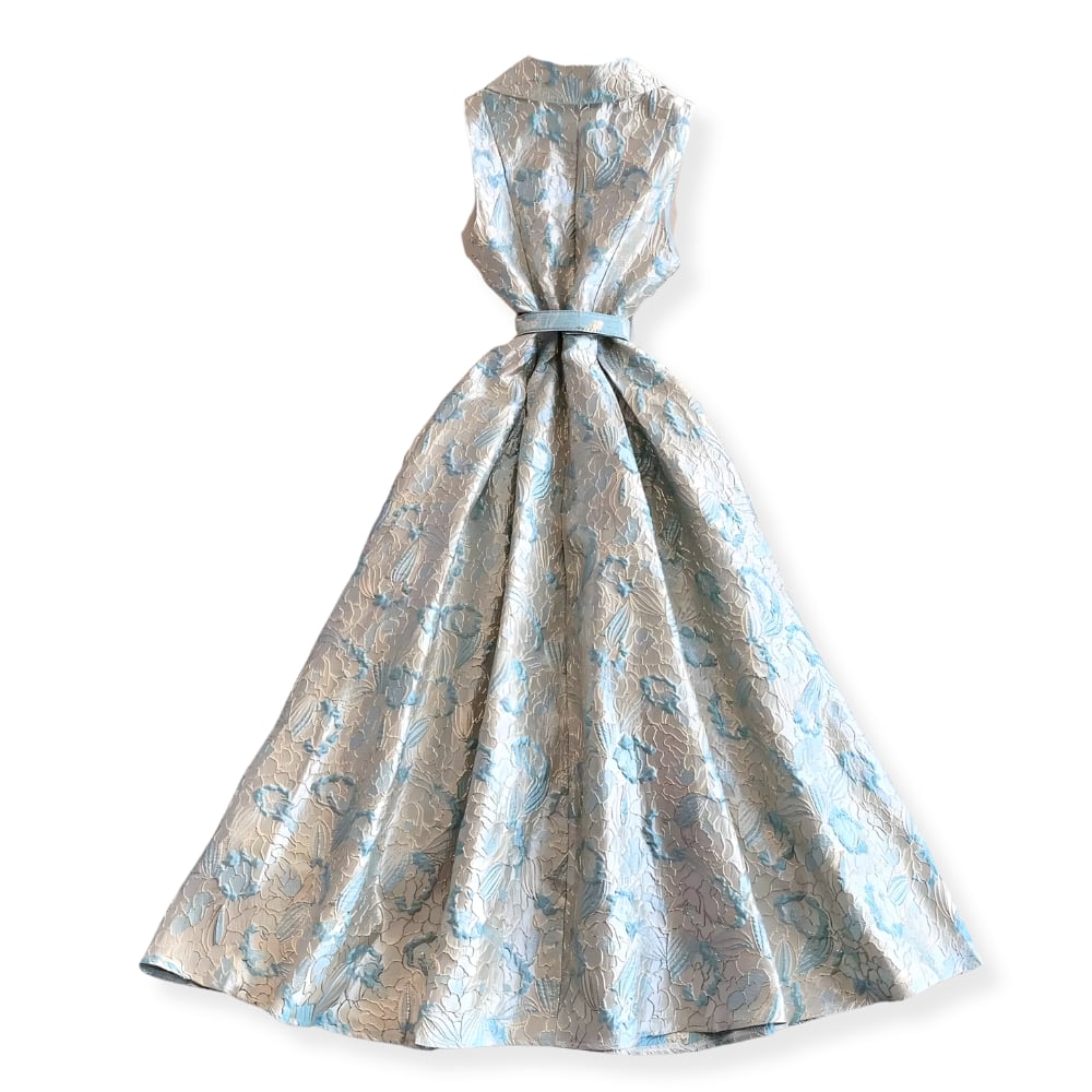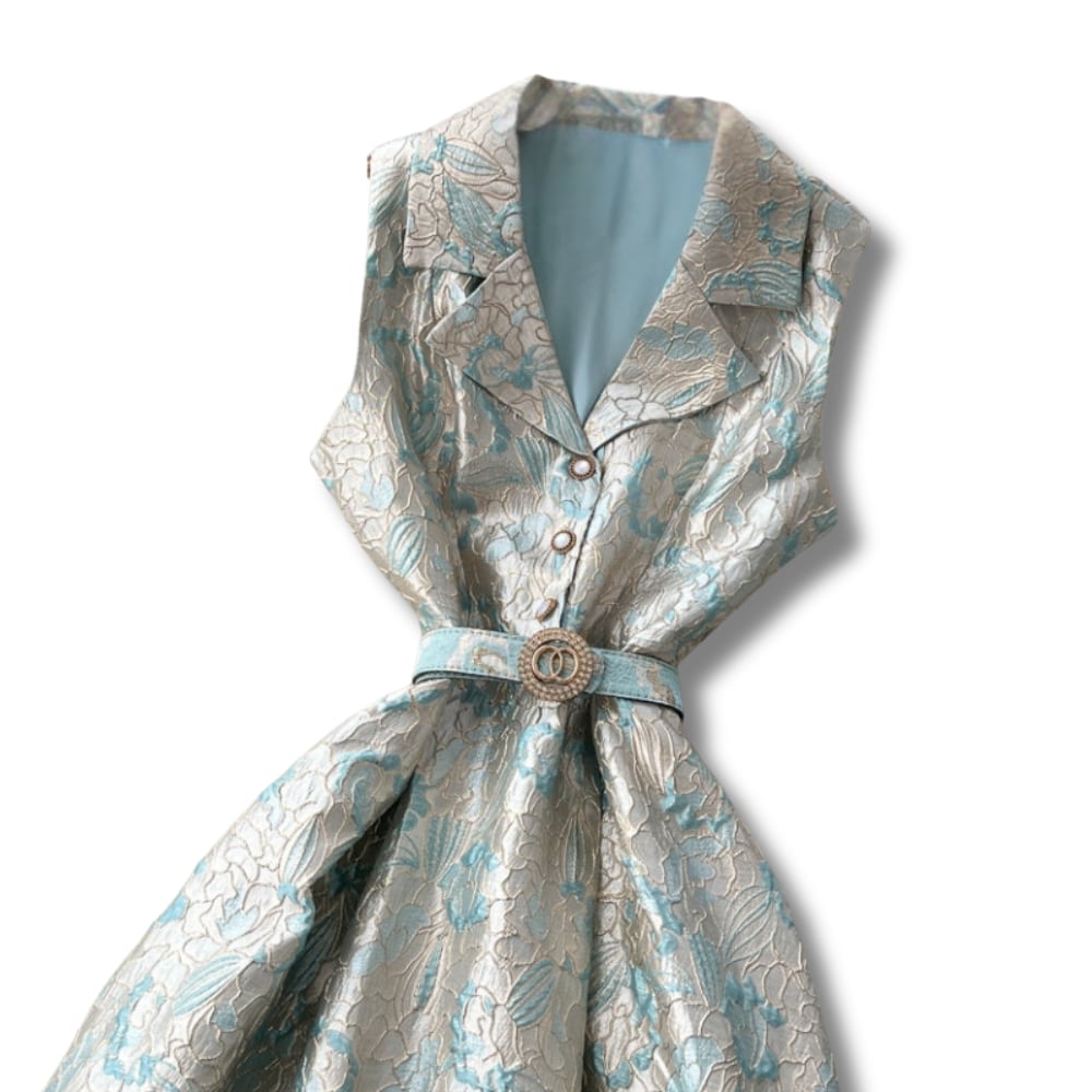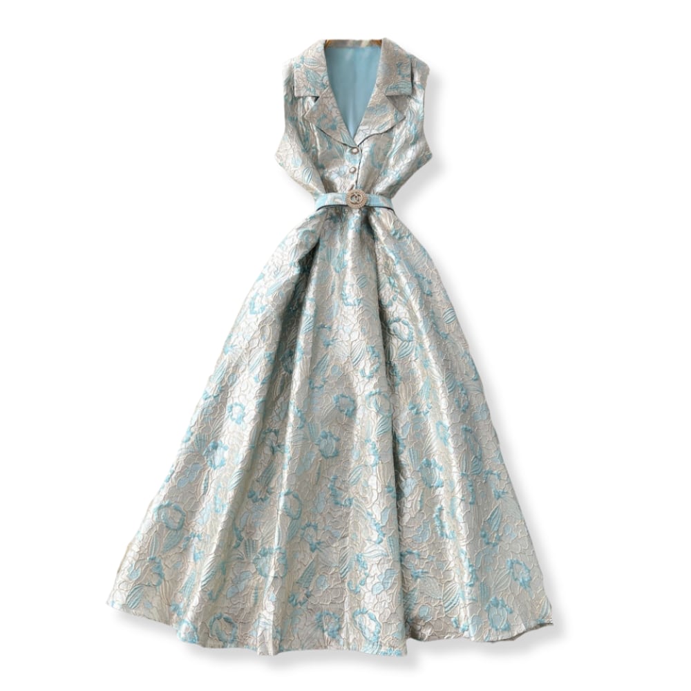 送料無料 ◆D2697 ベルト付き 開襟 クラシカルボタン ジャカード ノースリーブ ロング ドレス ワンピース《 ライトブルー×ゴールド》 ジャガードドレス ジャガードワンピース 水色 ゴールド ロングワンピース マキシ ミモレ丈 インポート パーティードレス お出かけ メール便 水色ワンピース パーティーワンピ 結婚式 2次会 パーティー お呼ばれ お呼ばれワンピース お食事 ひざ丈 おしゃれ インポートワンピース フォーマル オケージョン オケージョンドレス