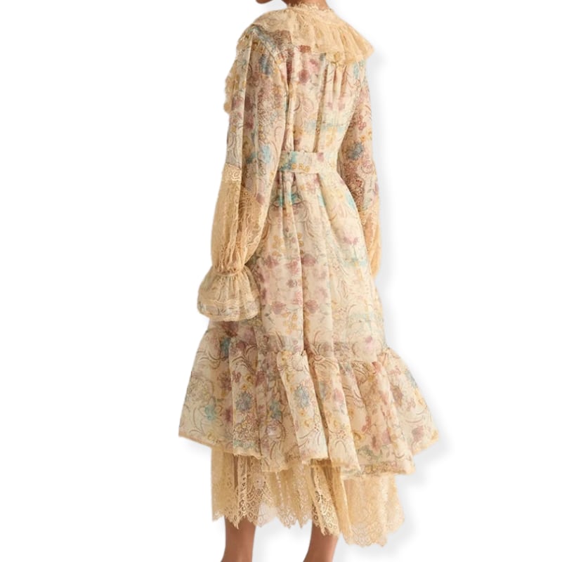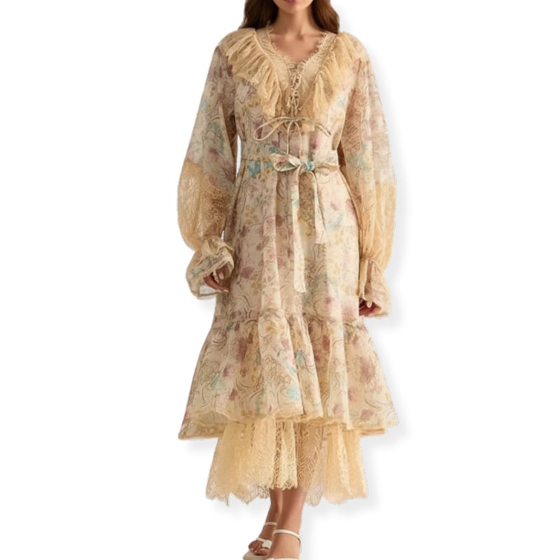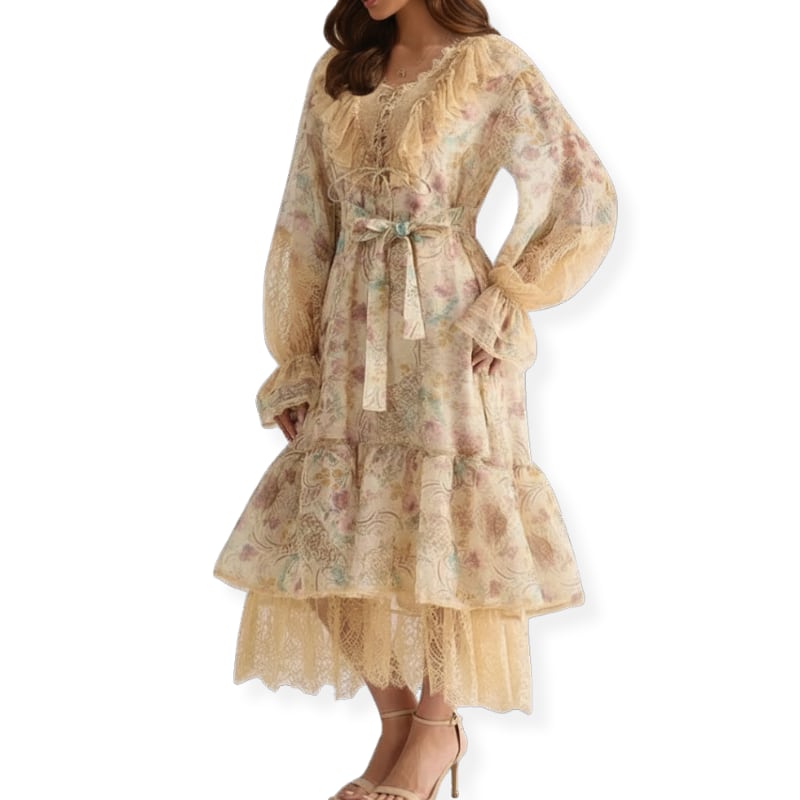 送料無料 ◆ D2700 ペチコート&リボン付き レースアップ キャンディースリーブ クラシカル レース ロング ワンピース《 ベージュ 》長袖 襟付き ペイズリー 花柄 ライトグリーン ミントカラー ミントブルー ロングスリーブ ワンピース マキシ丈 お出かけ 清楚 上品 インポートワンピース パーティードレス 衣装 柄ワンピース 柄物 パーティー 華やか エレガント マキシ エレガント 上品 清楚 衣装 花柄 シャツワンピ オケージョン