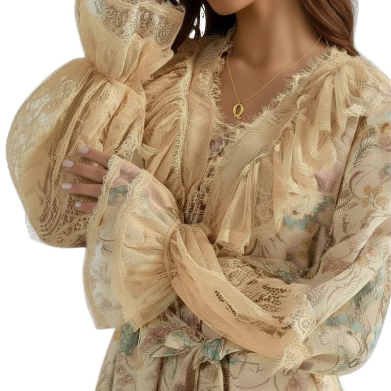 ベージュのレースが肩や首元、袖、裾に付いています