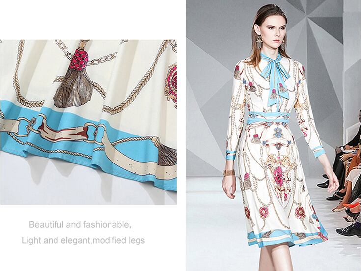 送料無料 ◆D109 スカーフ柄 リボンタイ ワンピース 《ホワイト》水色 結婚式 二次会 パーティードレス 長袖 袖あり 膝上丈 発表会 女子会 お食事会 ドレスワンピース お出かけ お呼ばれ 他と被らない お洒落 大人可愛い 華やか ボウタイ