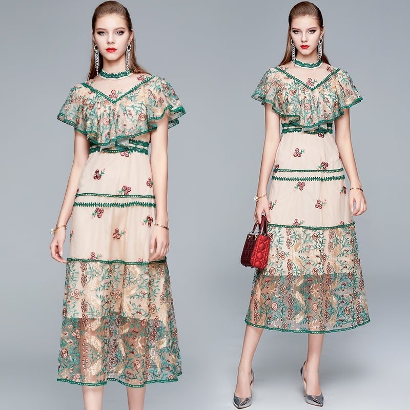 《葵わかなさんご着用》送料無料 ◆ D412 グリーン レース パイピング 刺繍 ヨーク フリル ワンピース 《 ベージュ×グリーン 》ハーフ袖 緑 袖あり シアー ミモレ 花柄 フラワーレース 膝丈 インポートワンピース メール便 ハーフ袖 袖付き 裏地あり 透けない 上品 エレガント 花柄 結婚式 お呼ばれドレス ロングワンピース マキシ ライトベージュ パーティー ワンピ インポートドレス フラワー