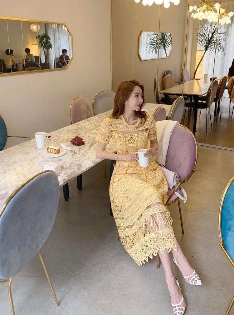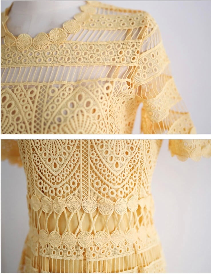 送料無料 ◆D437 ペチコート付き スカラップ パンチング クロッシェレース ワンピース《 イエロー 》黄色 無地 クラシカル 総レース パーティードレス お呼ばれ 結婚式 メール便 パーティーワンピ 袖付き お呼ばれワンピース セミフォーマル ひざ丈 袖あり おしゃれ 透けない インポートワンピース お呼ばれ お出かけ 上品 柄なし