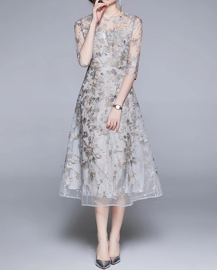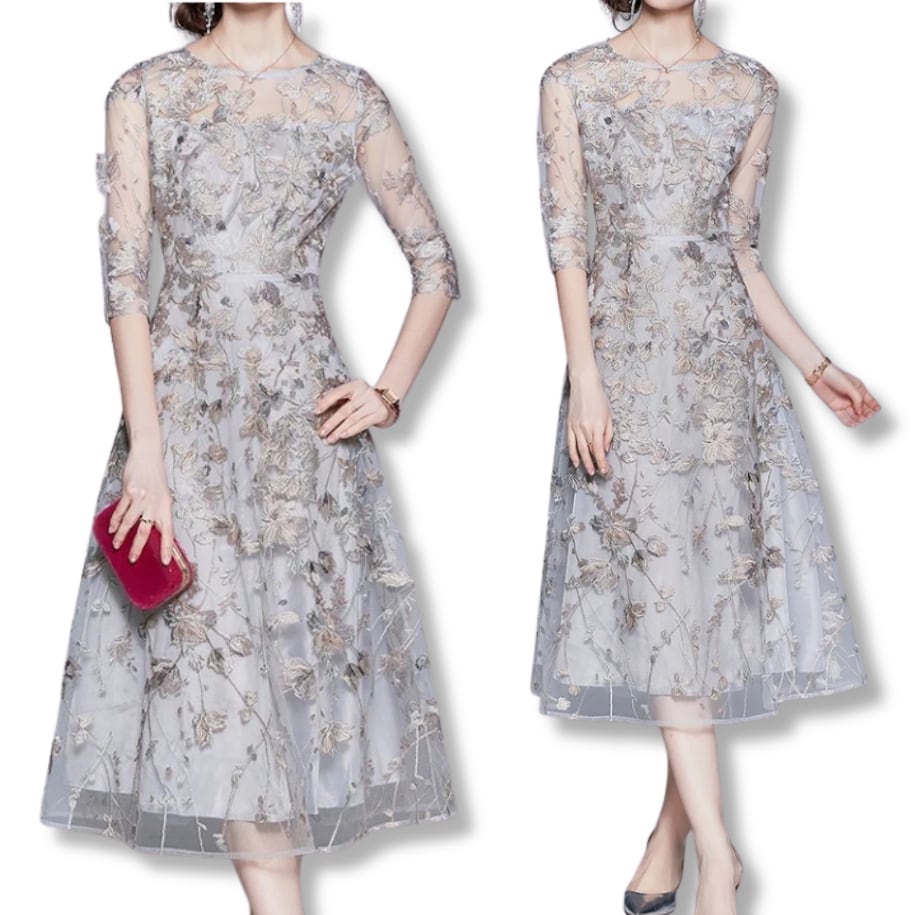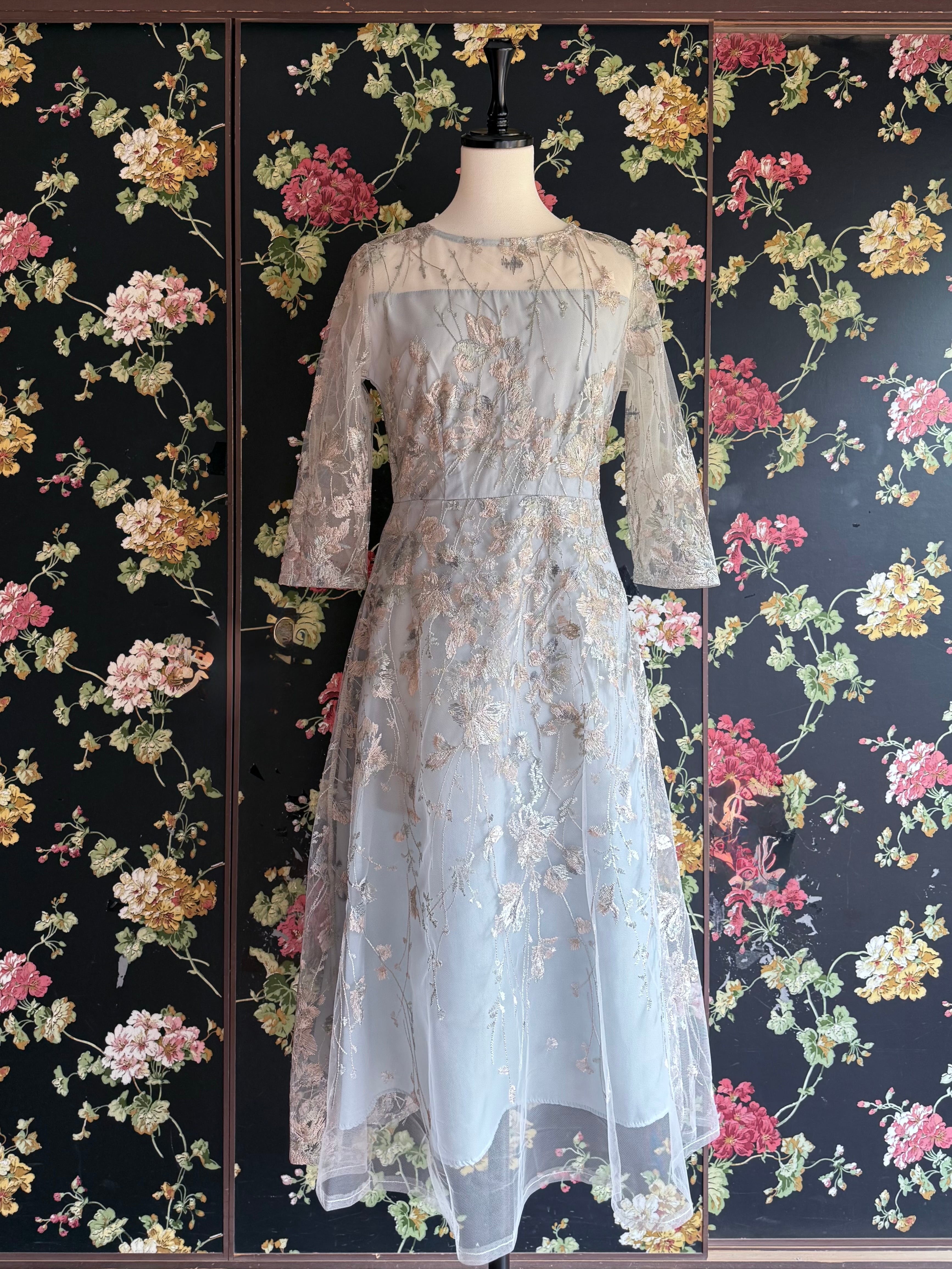 送料無料◆ D2456 フラワー 刺繍 レース 7分袖 ミディ ドレス ワンピース《シルバー》 シルバーブルー ライトブルー グレー 水色 裏地あり インポートワンピース ミント ベビーブルー 透け パーティードレス メール便 フリル パーティー 結婚式 お呼ばれ ワンピース ドレス 膝丈 オケージョン オケージョンドレス