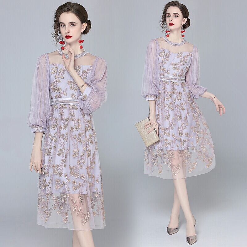 送料無料◆ D520 フラワー 刺繍 シアー パフ スリーブ ワンピース《 ラベンダー 》パープル 花刺繍 総刺繍 半ぽわん袖 パワースリーブ クラシカル レース 結婚式 ドレス 上品 紫 インポート パーティードレス メール便 パーティーワンピ お呼ばれワンピース お呼ばれ お出かけ お食事 ひざ丈 おしゃれ 袖あり インポートワンピース ゴールド 結婚式 ドレス