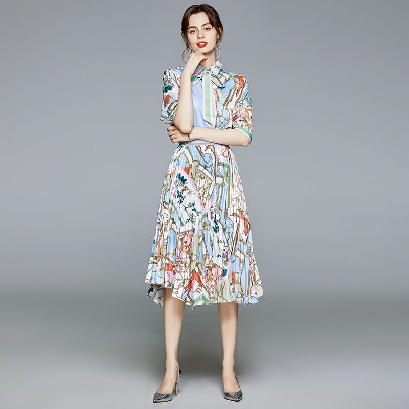 送料無料 ◆ D199 ストライプ リボン付き ポルカドット フラワー ハーフスリーブ ブラウス & アシンメトリー スカート セットアップ《ライトブルー×パステル》上下 ライン スカーフ柄 パッチワーク2点セット 2点組 上下セット ブラウス 膝下 ミモレ ロング 柄物 シルバー ウエストゴム 水色 メール便 ハーフ袖 ワンピース パーティードレス ひざ丈 インポートワンピース パーティー ワンピ 上品 華やか シャーベットカラー パステル アイシーカラー エレガント