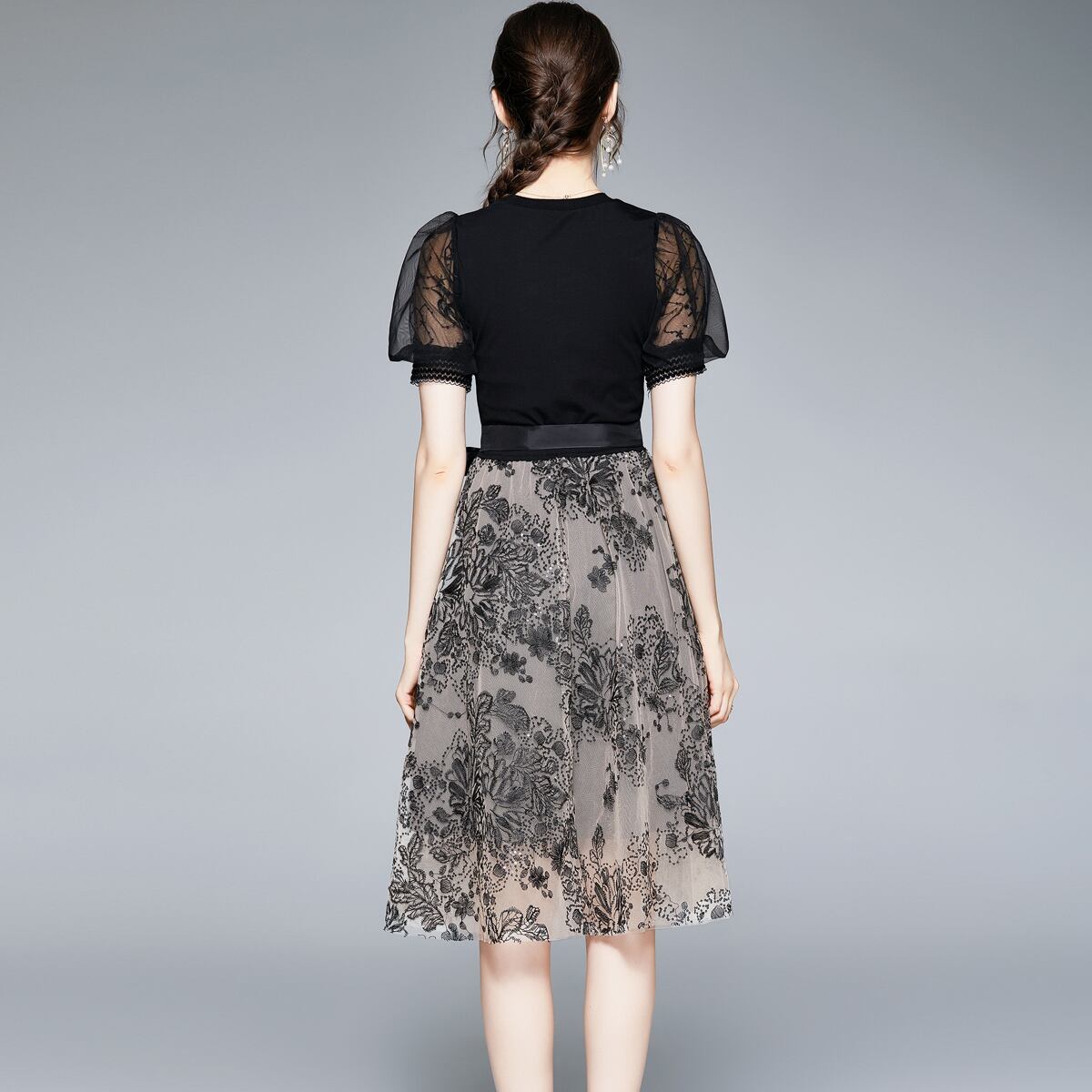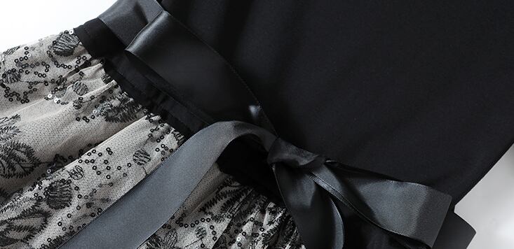 送料無料 ◆D589 リボン付き シアー スパンコール パフスリーブ × 刺繍 レース ワンピース《 ブラック×オフホワイト 》異素材 ミックス 黒 白 ブラックドレス 膝丈 透けない ミモレ丈 レース襟 ハーフスリーブ インポート パーティードレス お出かけ メール便 黒ワンピース パーティーワンピ 結婚式 2次会 パーティー お呼ばれ お呼ばれワンピース お食事 ひざ丈 おしゃれ 袖あり インポートワンピース ブラック 黒ドレス 透け感 チュールスカート