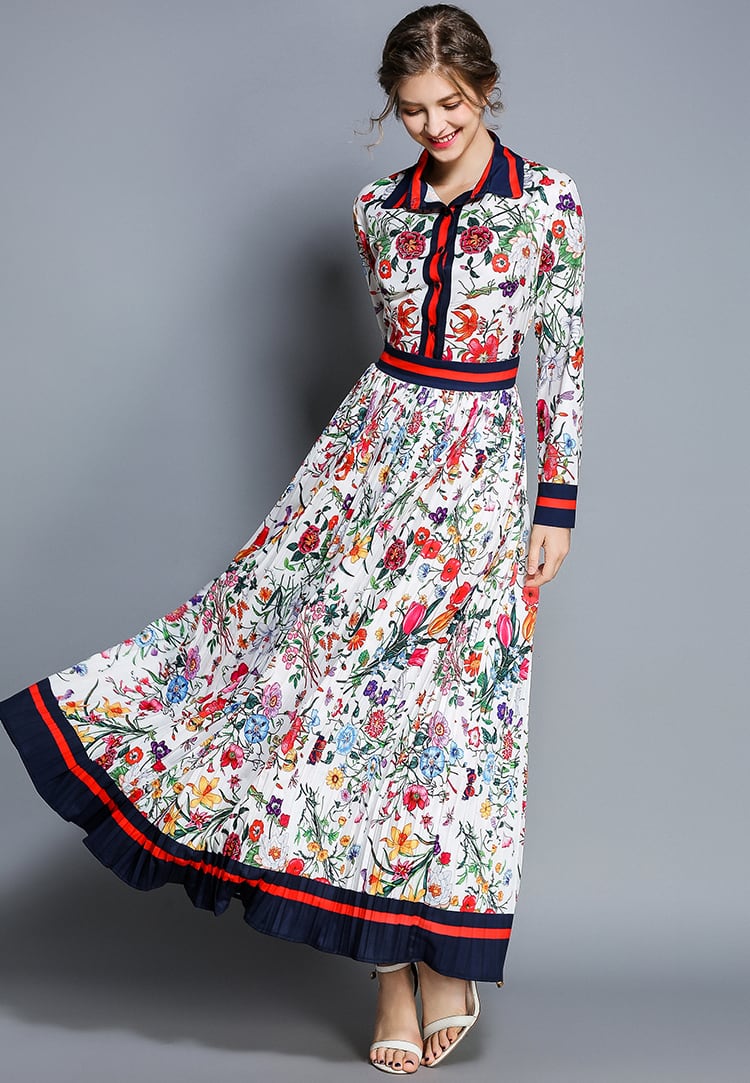 送料無料 ◆ D040 襟付き ネイビー × レッド ライン クラシカル フラワー プリーツ ロング ワンピース 《ホワイト×マルチ》長袖 マキシ丈 お呼ばれ 華やか フラワープリント パーティーコーデ パーティードレス ドレスコーデ 花柄 マキシ ロングワンピース 花柄ワンピース 花柄 クラシック オールド ヴィンテージ 衣装 襟付き シャツワンピース 長袖 袖あり 総柄 柄物 柄ワンピース 謝恩会 発表会 衣装 エレガント クラシカル