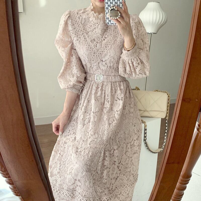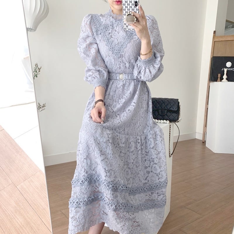 送料無料 ◆ D722 ベルト付き フラワー クロッシェレース 長袖 ロング ワンピース 《ブルーグレー・オフホワイト》パフスリーブ ロングスリーブ レース スタンドネック レースカフス ミモレ 膝下 インポート パーティードレス カジュアル フレア 裏地付き メール便 パーティーワンピ お呼ばれワンピース お呼ばれ お出かけ お食事 ひざ丈 おしゃれ 袖あり インポートワンピース 上品 ベルト付き 結婚式 衣装 カジュアル ドレス 《指原莉乃さん、田原萌々アナご着用》