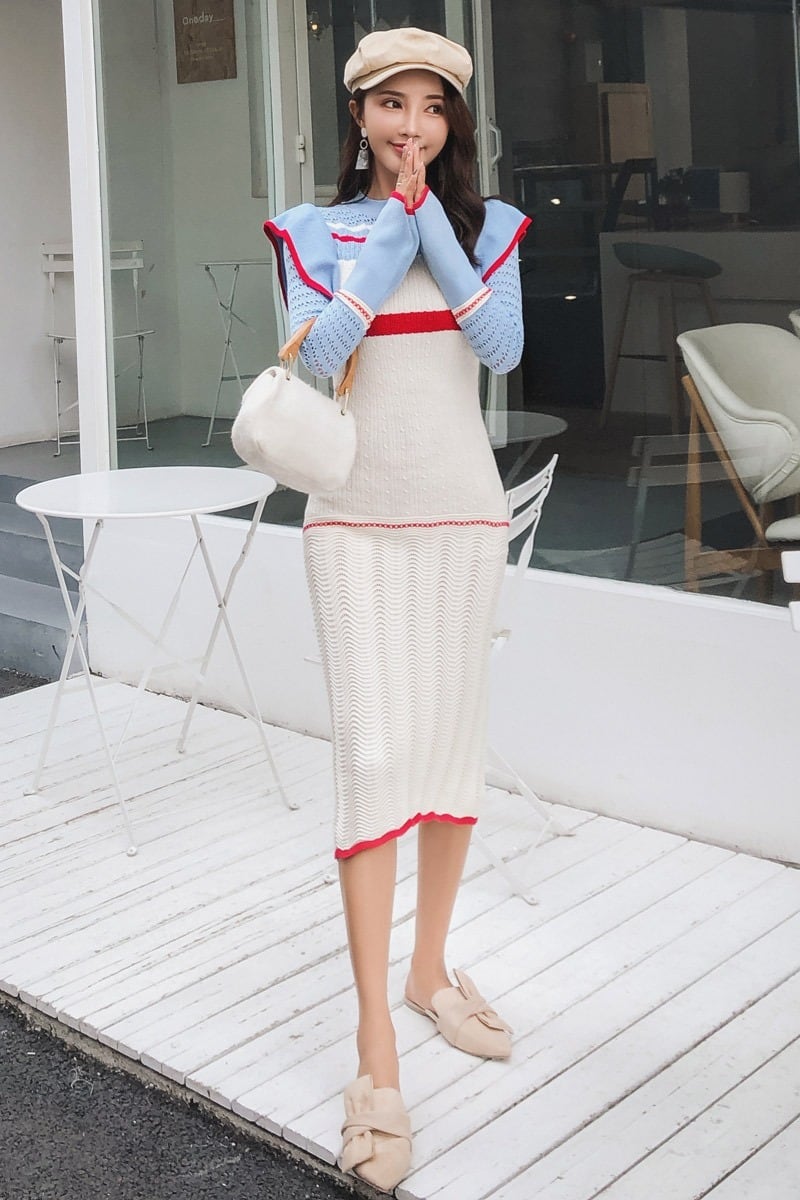 ホワイト、ライトブルー、レッドの3色ニットワンピース