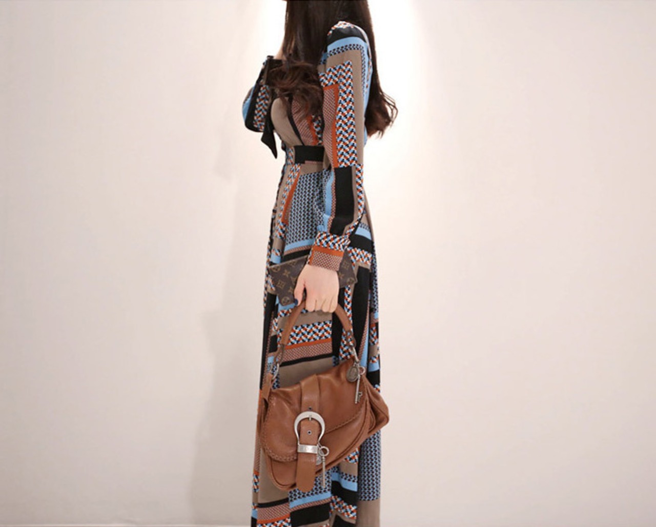 送料無料 ◆ D735 ブラック ボウタイ 付き ジオメトリック オレンジライン 前開き 長袖 ワンピース《ベージュ×ライトブルー》黒 水色 オレンジ 白 カラフル マルチカラー 幾何学模様 幾何学 長袖 ロングスリーブ ロング 袖ありクラシック 柄物ワンピース 柄ワンピース 柄物 レトロ ヴィンテージ風 ワンピース クラシックワンピース ドレスワンピース 袖あり 長袖 ミモレ 膝下 膝丈 膝下丈 ミモレ ワンピース お呼ばれ 上品 カジュアル メール便 ベージュブラウン