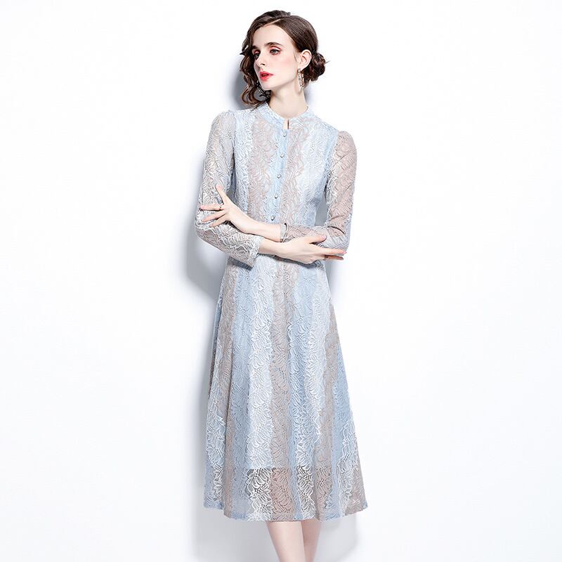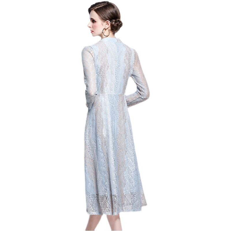 送料無料 ◆ D1324 グラデーションレース パールボタン 長袖 ロング ワンピース《ライトブルー》水色 マキシワンピース ライトグレー グレー フレア 無地 グラデ ワンピース レース 膝丈 ロング ブラワーレース インポートワンピース お呼ばれ 結婚式 パーティードレス メール便 パーティーワンピ 袖付き お呼ばれワンピース セミフォーマル ひざ丈 長袖 裏地付き 透けない インポートワンピース お呼ばれ 上品