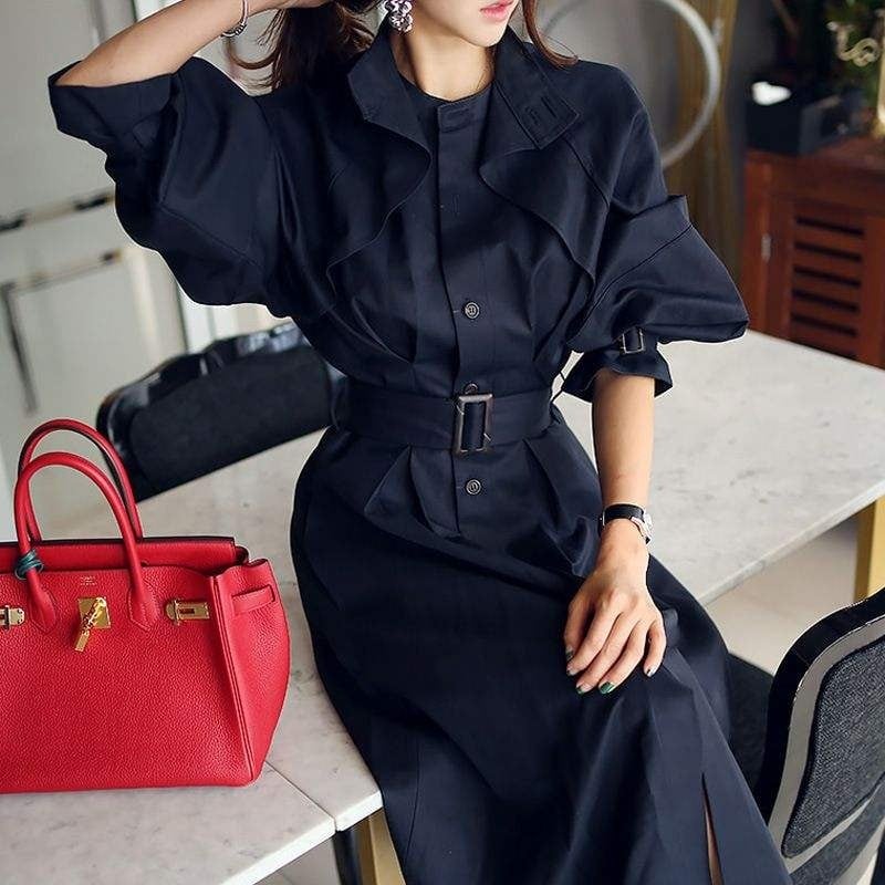 送料無料 ◆ D823 ベルト付き 前開き スタンドネック ラグランスリーブ カフスベルト シャツ ワンピース《 ネイビー 》濃紺 シャツワンピ トレンチコート ライトアウター ワンピ ボリュームスリーブ バルーンスリーブ コート スプリングコート 前ボタン ベルト 長袖 長袖 無地 インポートワンピース メール便 無地ワンピース 上品 セミフォーマル オフィスカジュアル オフィス フォーマル