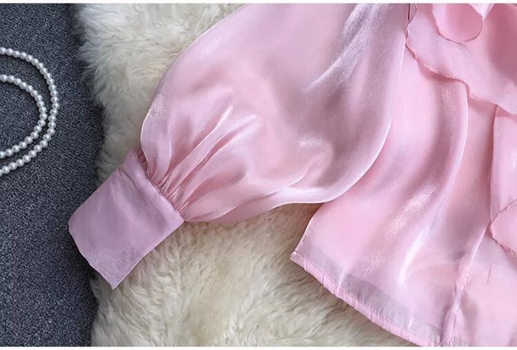 送料無料 ◆ D731 ツヤ フリル シアー 胡桃ボタン カフス ドレスシャツ ブラウス 《 ライトブルー・ ピンク・ホワイト 》白ブラウス 白シャツ グレーシャツ ピンクシャツ シアーブラウス リボンブラウス ロングスリーブ 袖あり 無地 パワースリーブ ラッフル シャツ フォーマル 白シャツ セミフォーマル トップス 前開き 前ボタン フリル袖 インポート パーティードレス カジュアル メール便 モード おしゃれ お出かけ お呼ばれ 《まるぴさんご着用》