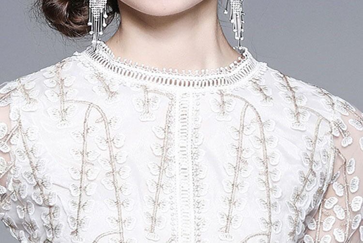 送料無料 ◆ D882 フラワー 刺繍 レース フレア ドレス ワンピース《ホワイト×ゴールド》総刺繍 刺繍ワンピース ゴールド刺繍 ホワイト刺繍 ロングワンピース チュールワンピース 裏地あり ドットチュール インポートワンピース 白ワンピース 白ドレス 透け パーティードレス メール便 フリル パーティー 結婚式 お呼ばれ ハーフスリーブ 長袖 袖あり ワンピース ドレス 膝丈 ワンピース