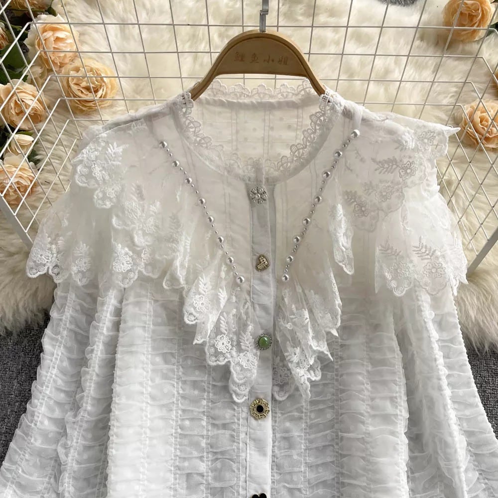 様々なクラシカルモチーフボタンを使ったレースドレスシャツです