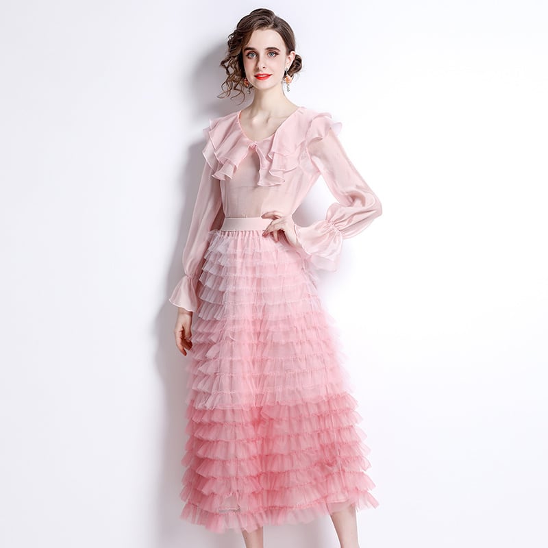 送料無料 ◆ D905 ツヤ シアー ブラウス & ティアード グラデーション ロング スカート セットアップ 《 ライトブルー・ピンク》上下セット ツーピース 2点セット セット コーデセット 上下 スカート 長袖ブラウス シアーブラウス ウエストゴム トップス フリル チュール ティアード 襟付き プルオーバー シャツ ワンピース パーティードレス 2点 お呼ばれワンピース パーティーコーデ 衣装 チュールスカート 《村重杏奈さん、上西星来さん、しなこさんご着用》