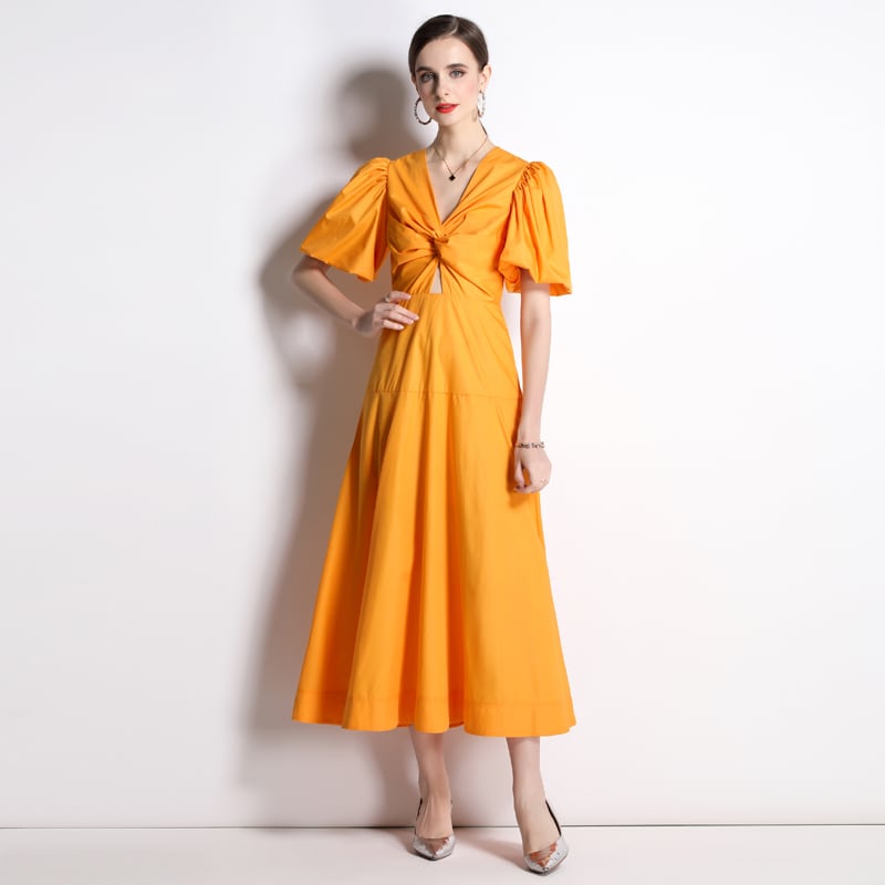 送料無料 ◆ D974 バルーンスリーブ Vネック ウエスト カットアウト フレア ワンピース《 オレンジ 》オレンジワンピース イエローワンピース サンドレス オレンジ 黄色 オレンジワンピース ハーフスリーブ 無地ワンピース ロング 膝下 ミモレ ひざ下丈 袖あり 柄物 マキシ パーティードレス メール便 長袖ワンピース パーティードレス インポートワンピース パーティー 肌みせ ヘルシー セクシー ワンピ 上品 衣装 華やか お出かけ フレア
