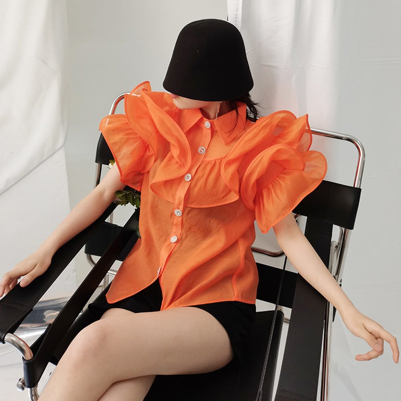 送料無料 ◆ D1060 襟付き ラッフルフリル ビジューボタン ツヤ シアー ドレスシャツ ブラウス《オレンジ/グリーン》 カラーシャツ ラッフル袖 フリル袖 リボンブラウス 無地 緑ブラウス オレンジブラウス カラーシャツ シアー 透け感 パワースリーブ パワーショルダー バルーンスリーブ シルバー 半袖 インポート パーティードレス ビタミンカラー キャンディーカラー メール便 袖あり 前開き トップス フリル