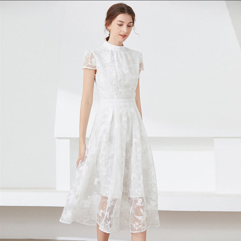 送料無料 ◆ D1115 ボタニカル 刺繍 スタンドネック フレンチスリーブ レース フレア ワンピース《ホワイト》総刺繍 白ワンピ ホワイトワンピース 膝下 ミモレ 白ワンピース ロングワンピース インポートワンピース パーティードレス メール便 パーティーワンピ 袖付き お呼ばれワンピース セミフォーマル ひざ丈 パール 透けない インポートワンピース お呼ばれ お出かけ 上品 白 オケージョン セミフォーマル 総レース フォーマル 衣装