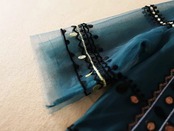 ブラック、ゴールド、シルバー、ピンクなどの糸を使ったライン刺繍が全体に施されています